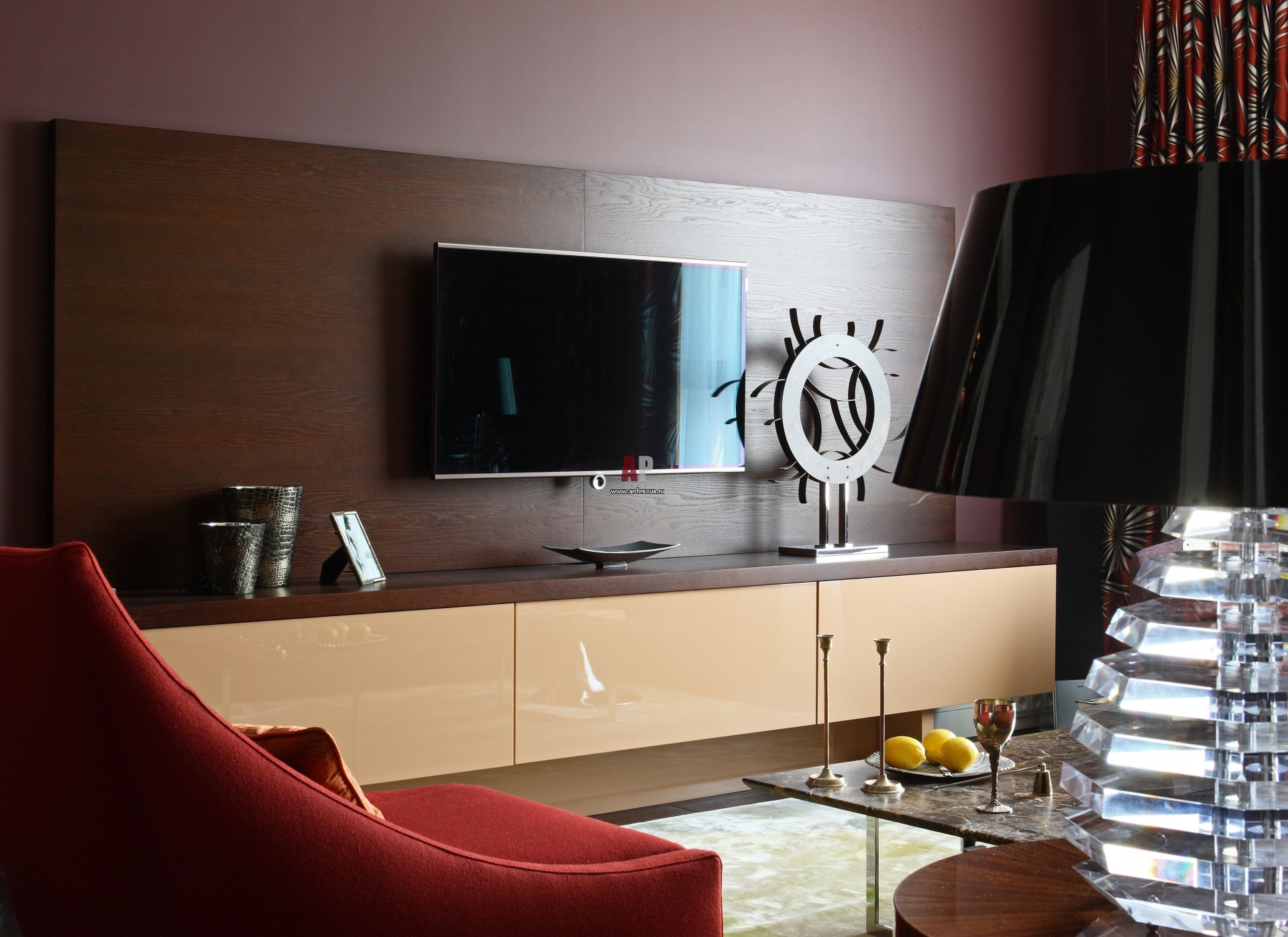 Дизайн гостиной квартиры со сложной цветовой палитрой. Тумба под ТВ сделана на заказ, «Мебельная линия Ирина Бубнова».