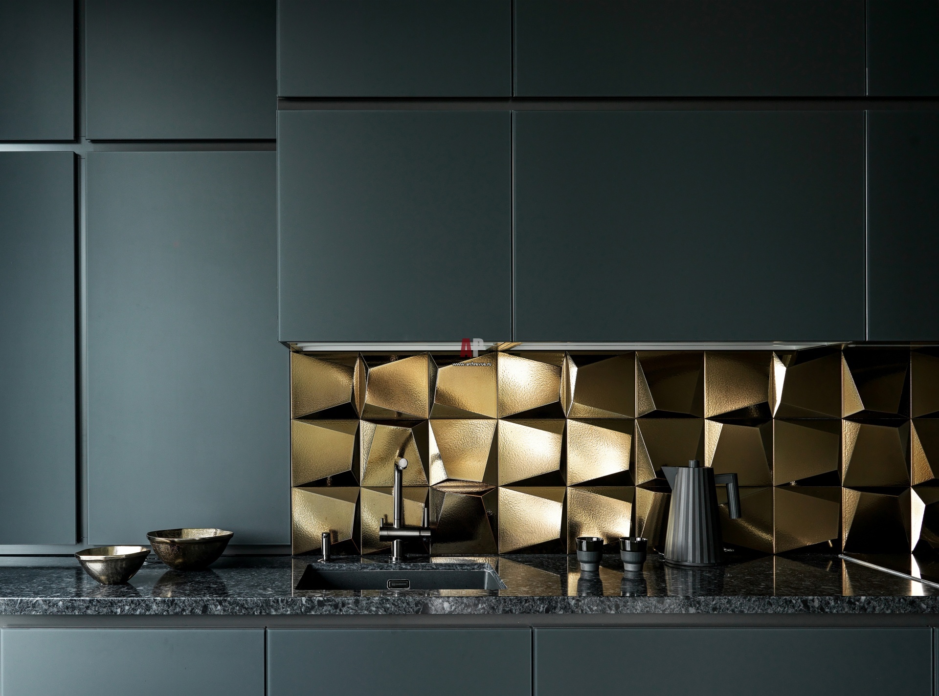 Акцент кухни – объемная золотая плитка на фартуке, LaDiva Ceramiche, коллекция via della SPIGA.