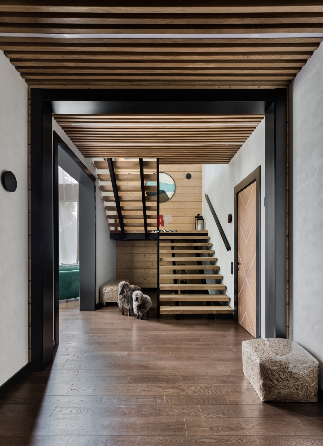 Лестничный холл. Потолок подшит реечными панелями из светлого дуба. Овечки, Meier.