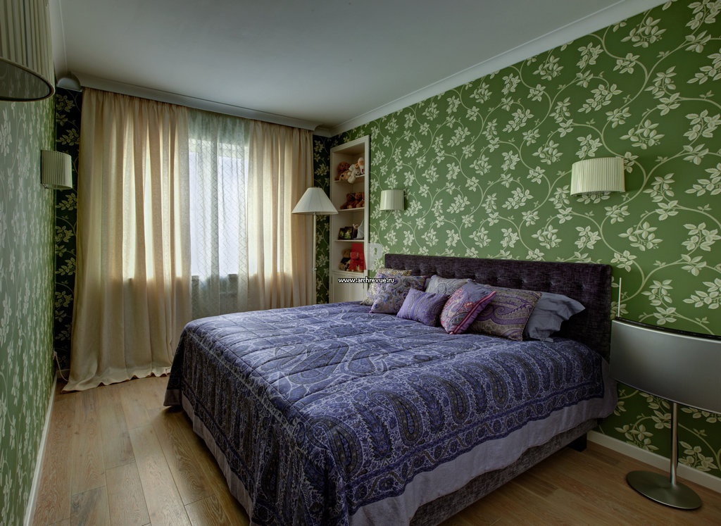 Дизайн яркой спальни для девушки. Стены оформлены обоями насыщенного изумрудного цвета с белым цветочным рисунком. Кровать с текстильной обивкой сиреневого цвета.
