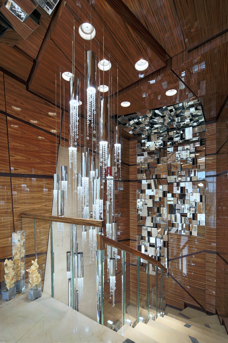 Вертикальная доминанта лестничного холла – хрустальный ниспадающий светильник.