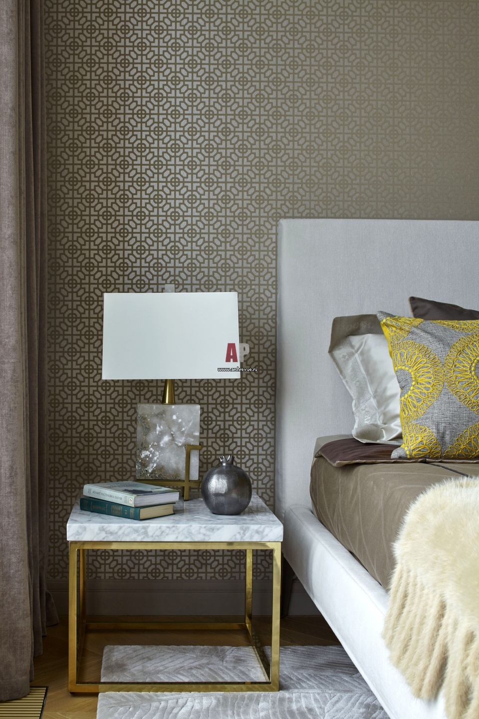 Интерьер спальни. Прикроватный столик с мраморной столешницей Halo, дизайн Тимоти Оултона. Декор – металлический гранат, Crate and Barrel.