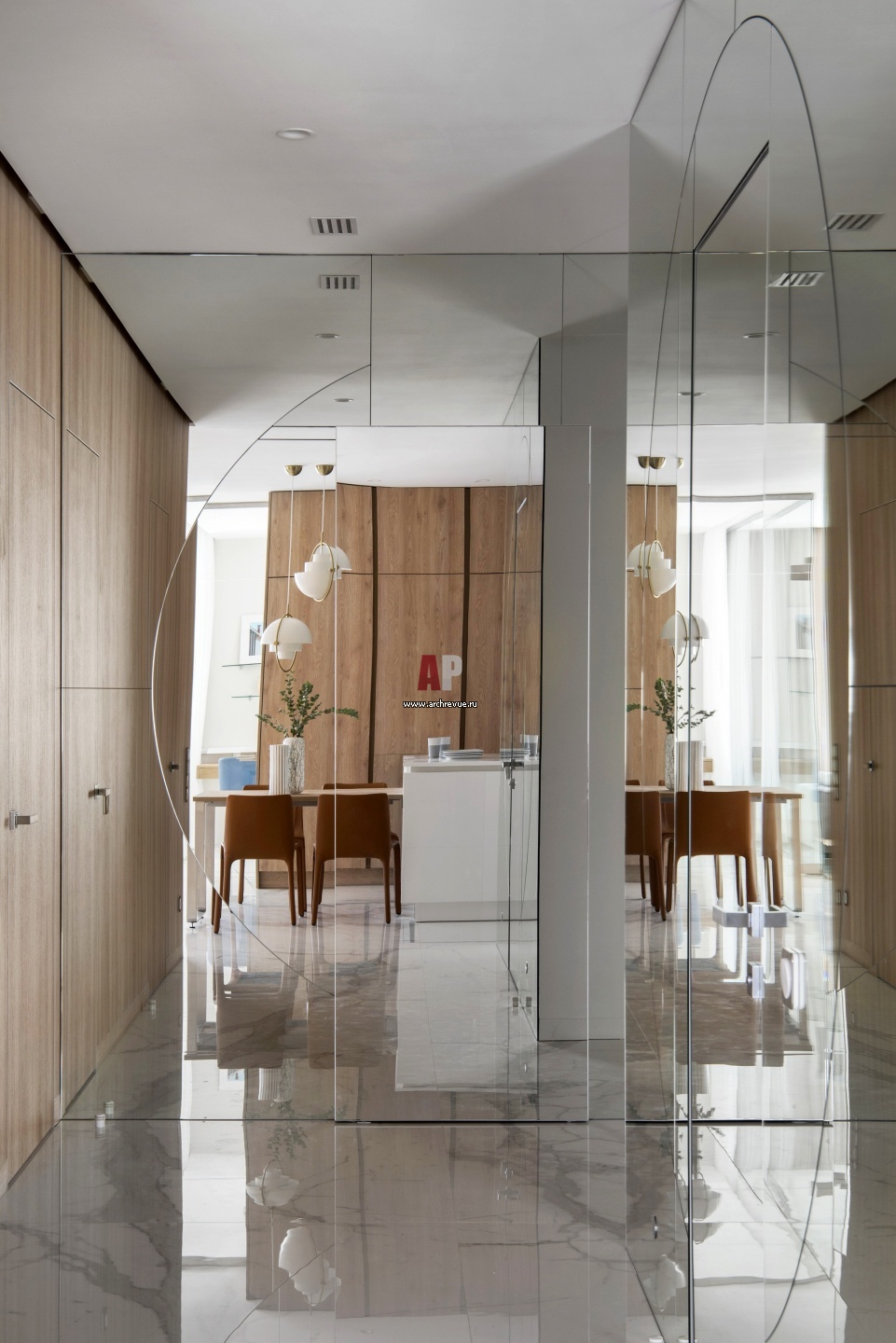 Интерьер прихожей. Зеркальное панно с радиальным рисунком и встроенными дверями сделано на заказ. На полу – крупноформатный керамогранит с фактурой мрамора Каллакато, Ariostea.