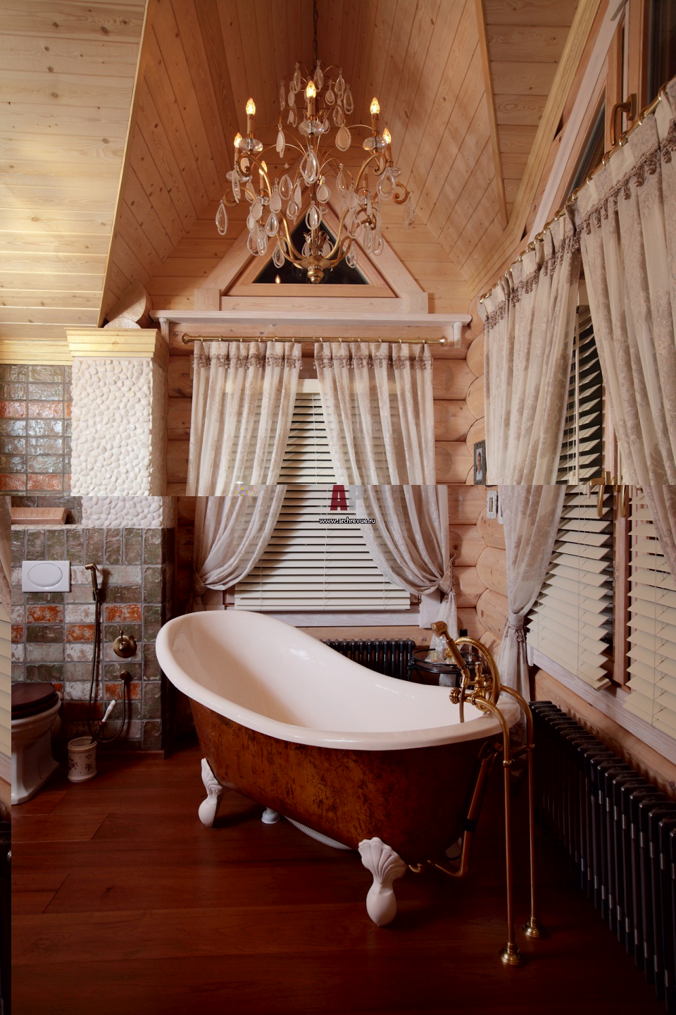 Фото интерьера ванной комнаты в деревянном доме. Отдельностоящая ванна на лапах в английском стиле, поставщик «Интерьерный салон» («Биг Бен»). Плитка уложена на конструкцию, имеющую скользящие направляющие по деревянным стенам. Это необходимо для сохранения прочности конструкции при усадке дома.