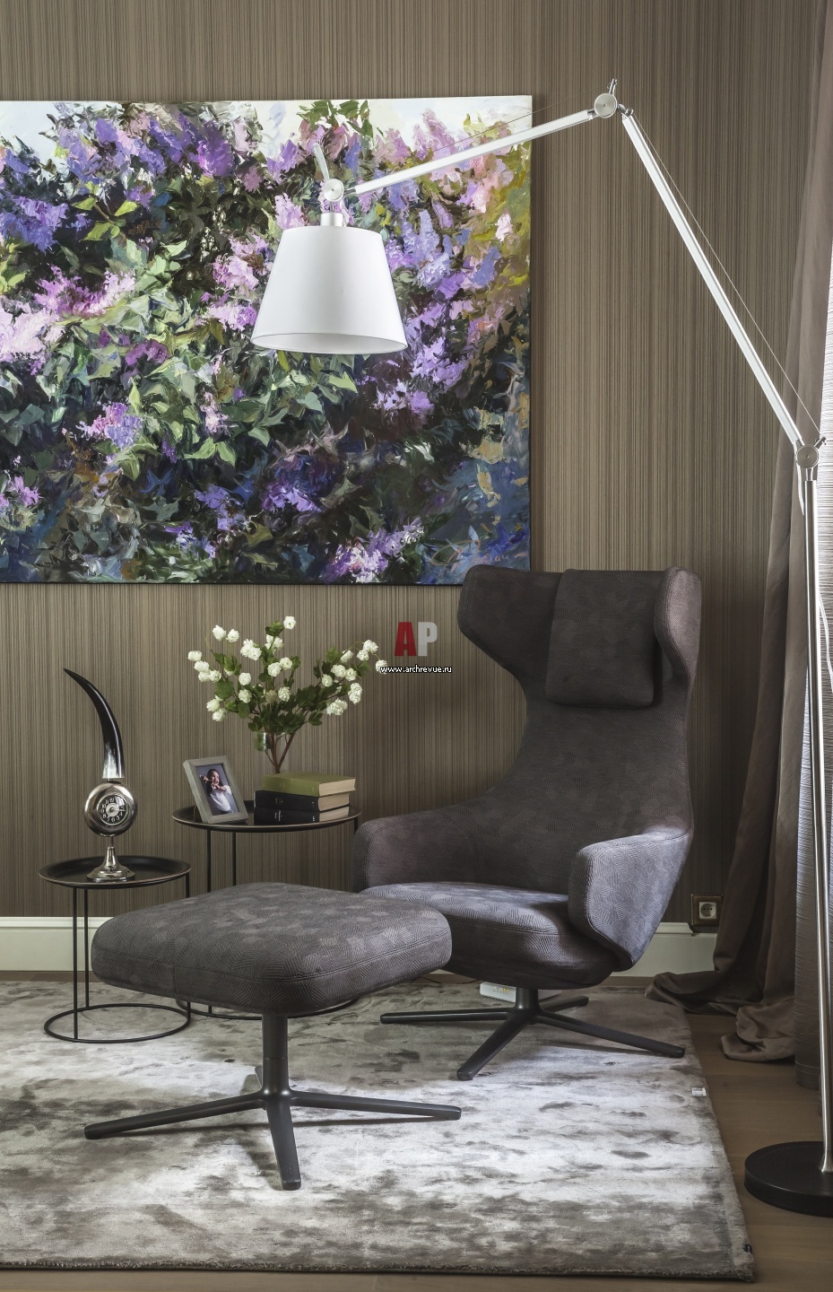 Интерьер мужской спальни. Кресло, банкетка Vitra. Столики, BoConcept. Живописные полотна выполнены на заказ специально для этого интерьера, художник А. Горлицына.