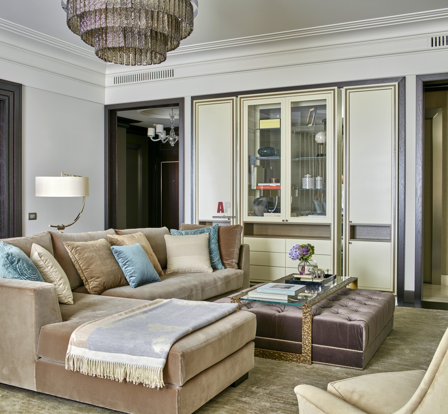 Интерьер гостиной исполнен в бежево-шоколадных тонах с бирюзовыми акцентами в виде текстиля. Люстра в стиле американского ар-деко, Rainbow.