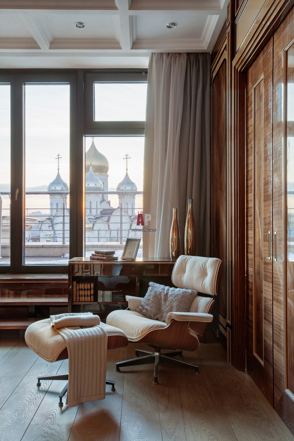 Рабочий стол, подоконники, консоль для книг, лестница на открытую веранду выполнены как единая композиция. Лакированные поверхности отсылают к эстетике ар-деко.