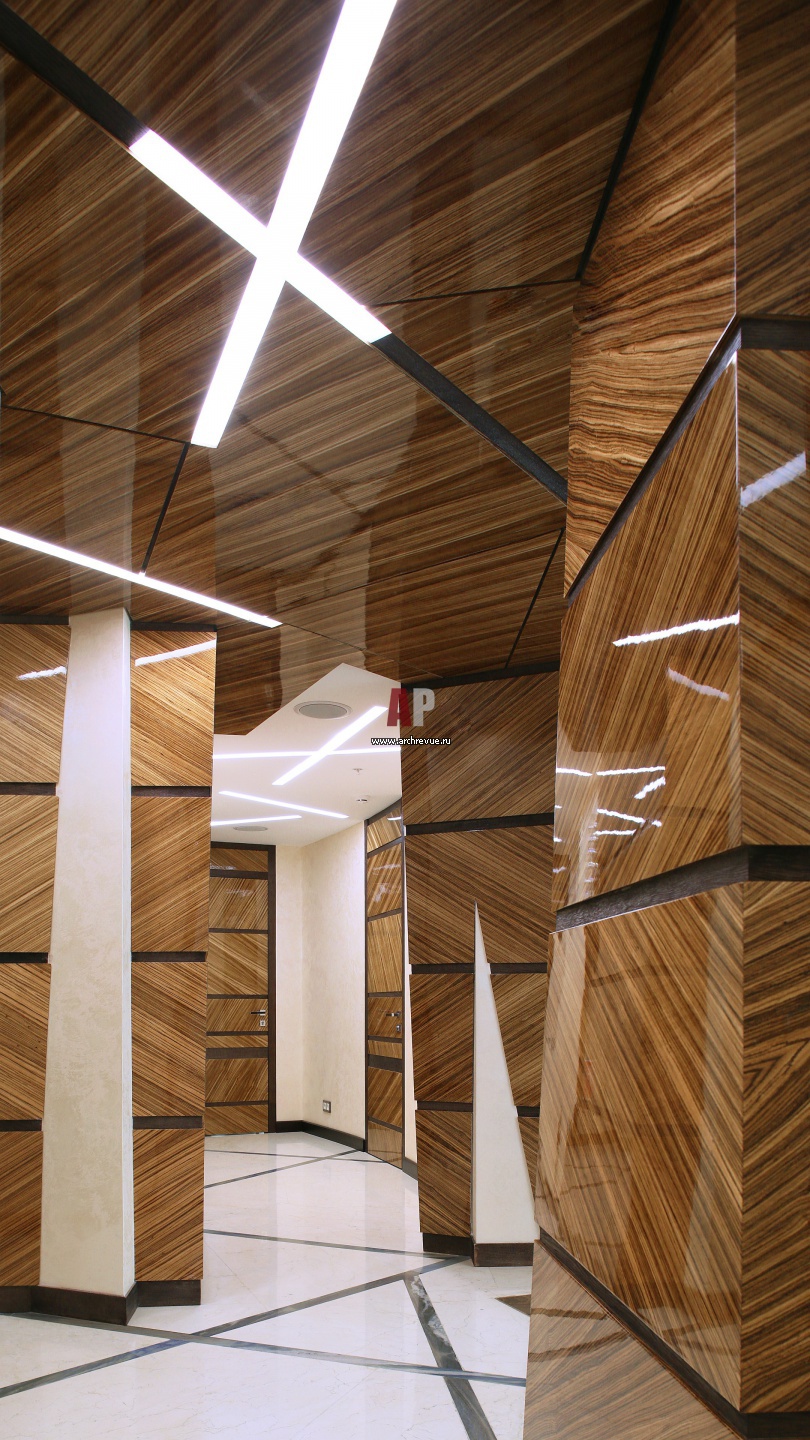 Деревянные панели из шпона зебрано с хаотичными рустами из ореха переходят со стен на потолок и придают интерьеру динамичность и графичность.