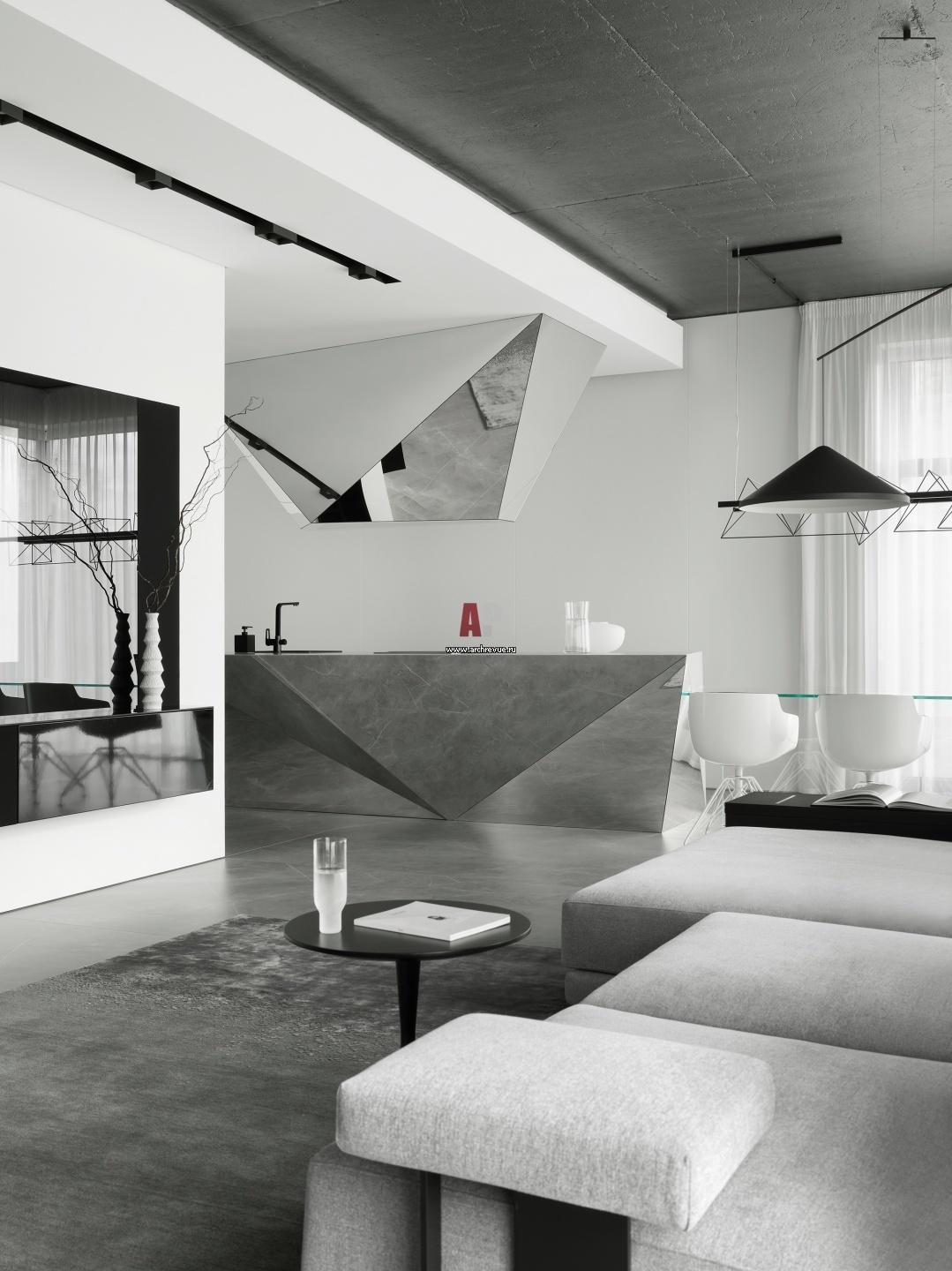Зона отдыха в гостиной. За черным стеклом спрятан телевизор.