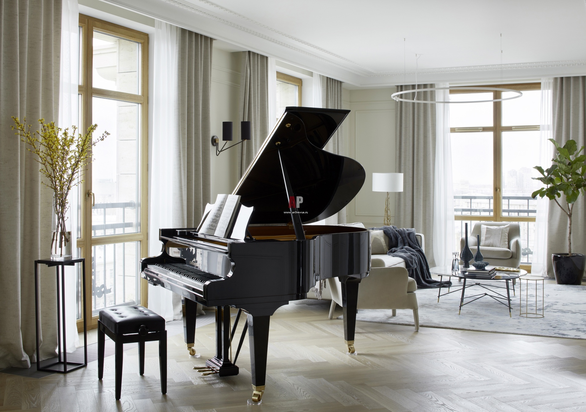 Музыкальная зона в гостиной. Концертный рояль, C.Bechstein. Бра, CTO Lighting. На полу – инженерная доска, беленый дуб.