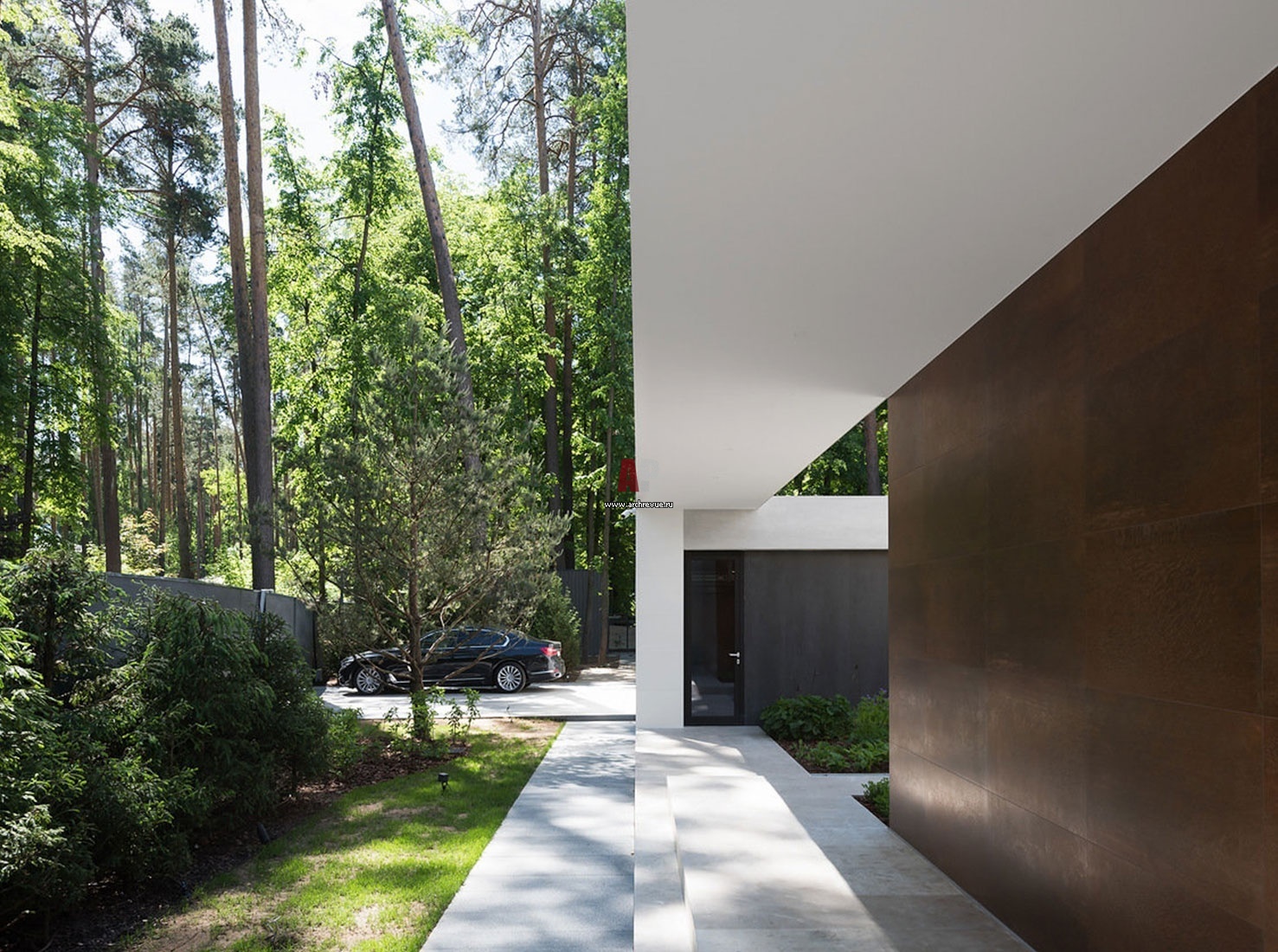 В перпендикулярном к основному жилому объему блоке находится гараж, музыкальная студия и помещения для персонала.