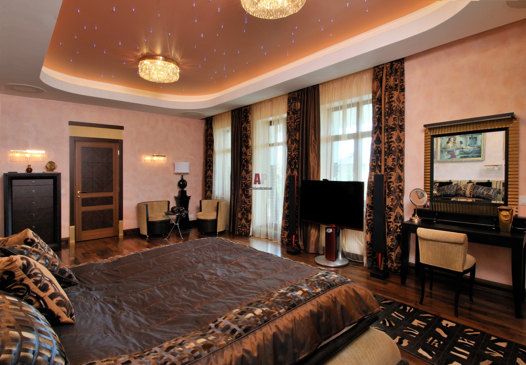 Интерьер спальни оформлен с помощью декоративных штукатурок в насыщенном оттенке, дверного портала, финишированного золотой краской и спального гарнитура Smania, поставщик «Москва-Рим».