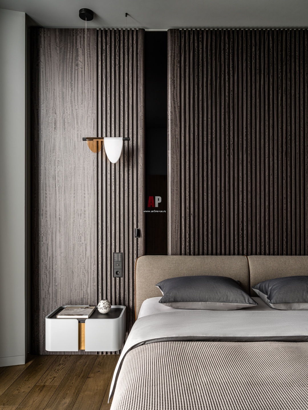 Панели со сложным рисунком за изголовьем кровати выполнены из шпона эвкалипта. Композиция имеет верхнюю подсветку, которая создает романтическую атмосферу.