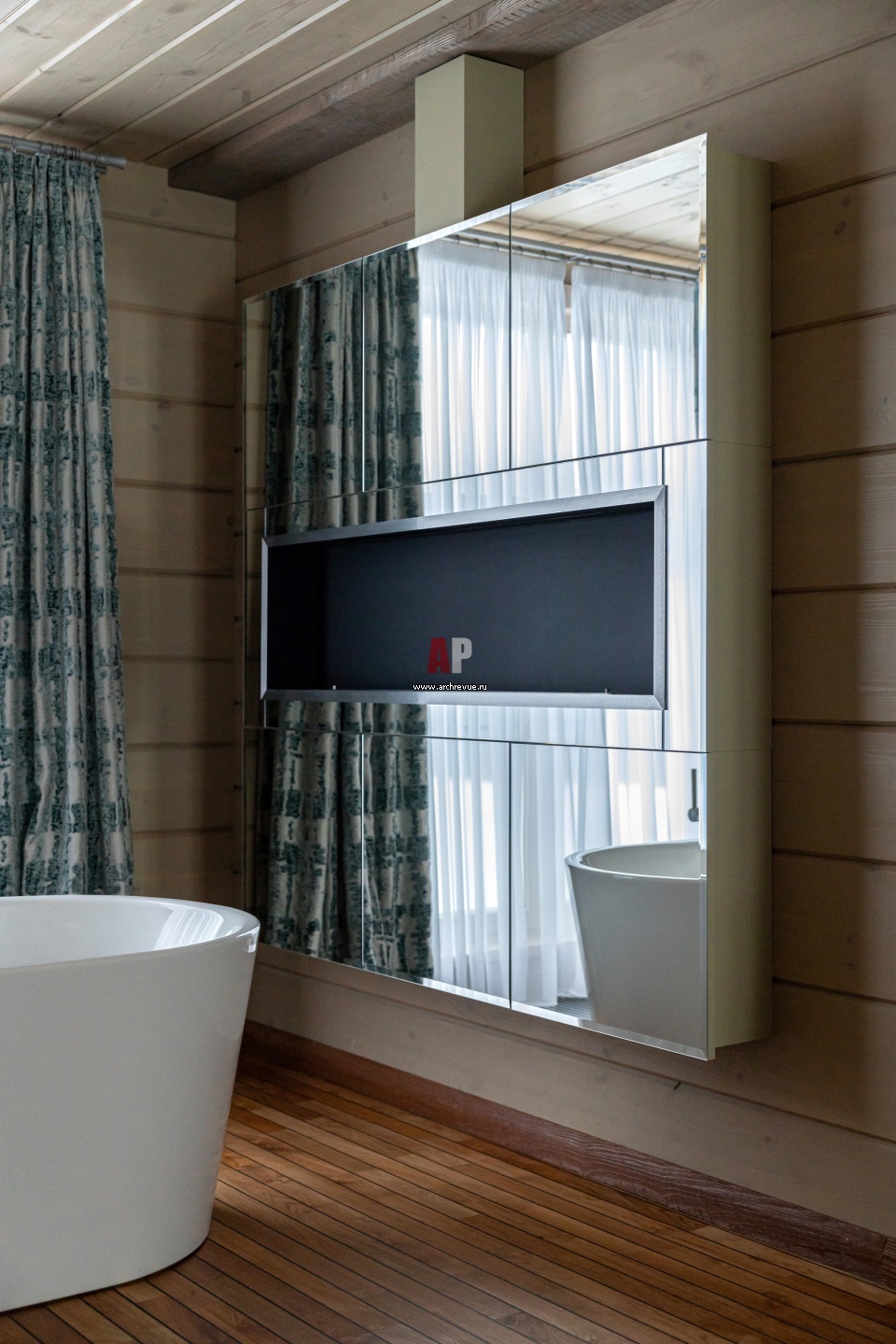 Фрагмент ванной комнаты. Зеркальный шкаф со встроенным биокамином изготовлен на заказ. Стены и потолок обработаны защитным составом, Tikkurila, Supi Saunasuoja.