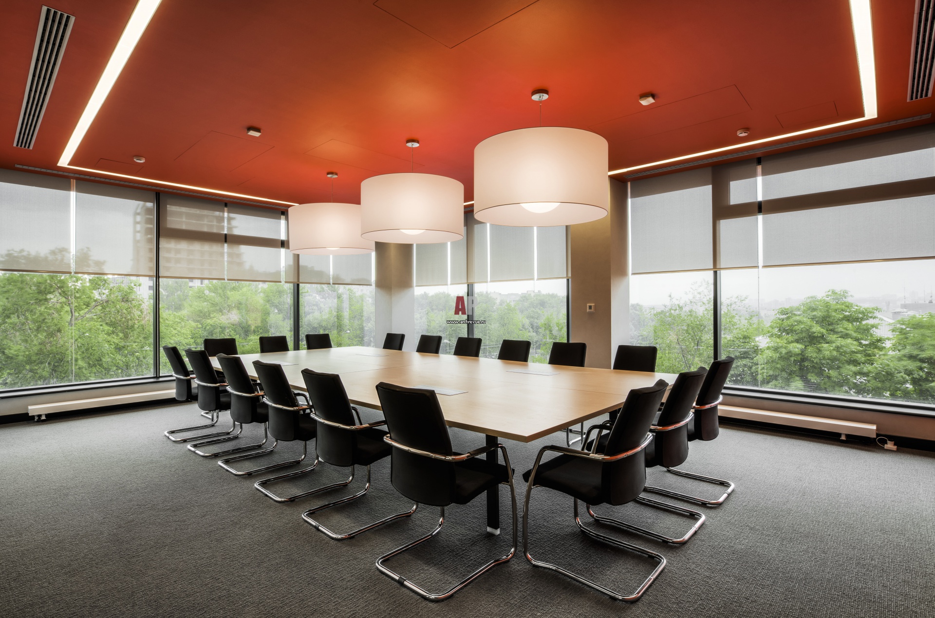 Красная переговорная с панорамным остеклением по двум сторонам. Стол выделен тремя потолочными светильниками с абажурами-барабанами.