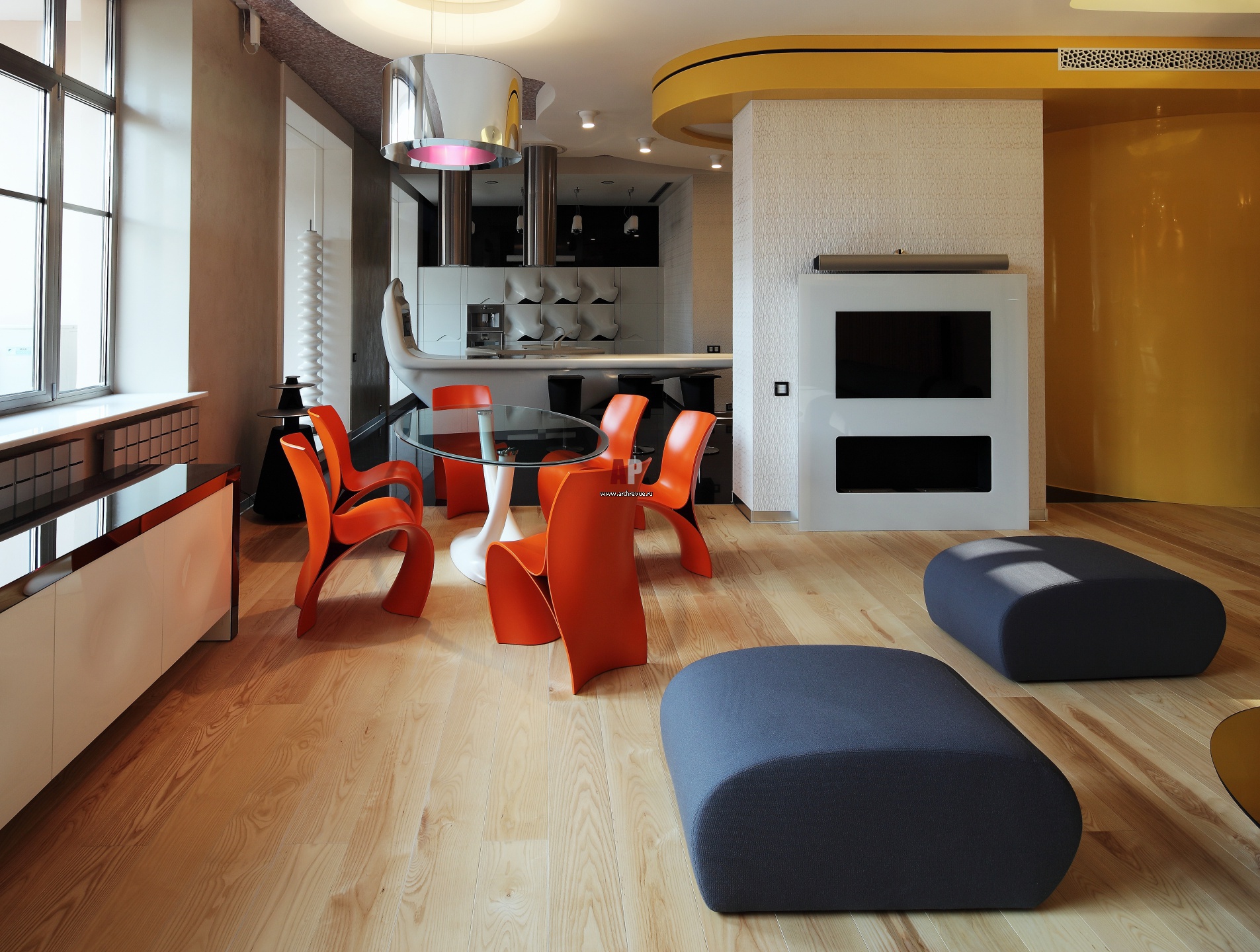 Интерьер зоны отдыха с камином в квартире в стиле футуризм. Пуфы, COR. Стулья из пластика, Moroso.