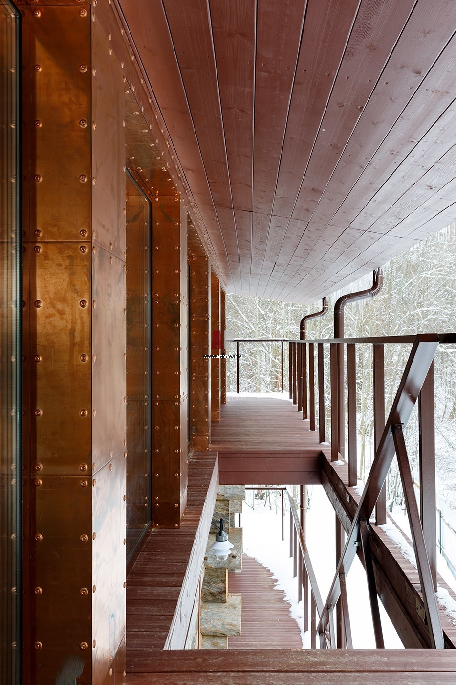 Архитектурная особенность дома – внешние обходные галереи с лестницами. Такой прием «изнутри наружу» визуально обогащает экстерьер традиционной деревянной постройки. Несущие конструктивные элементы верхнего этажа снаружи зашиты медными листами.