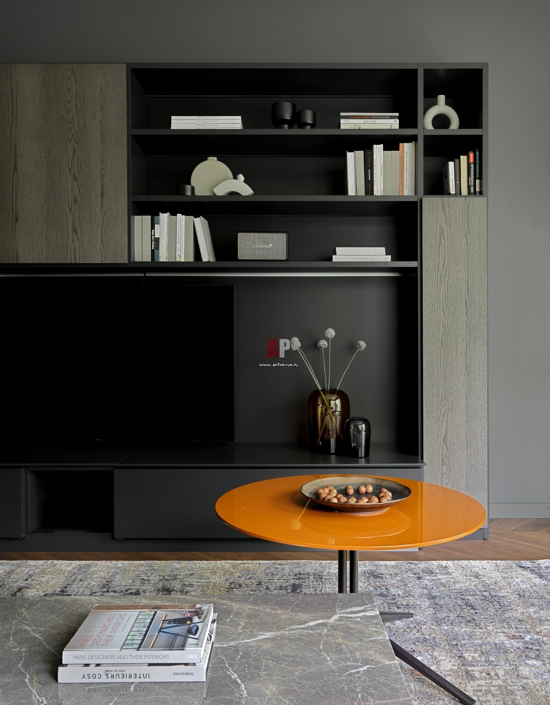 Квартира с темными стенами в лесу. Интерьер гостиной.