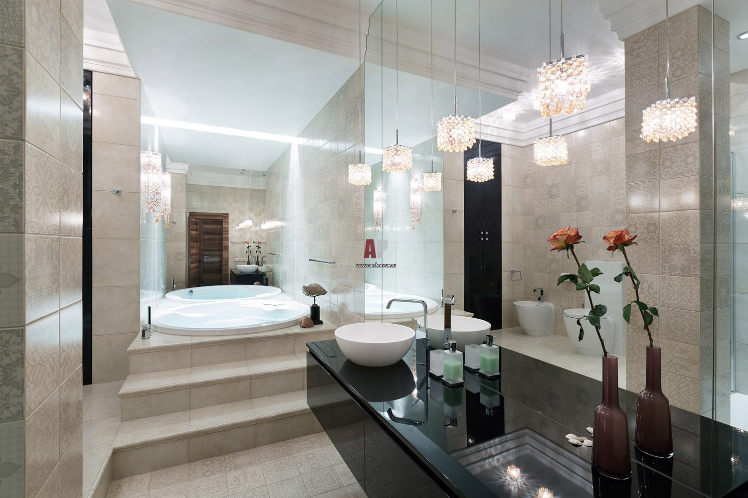 Хозяйская ванная комната. Круглая чаша гидромассажной ванны встроена в подиум. Зеркало во всю стену удваивает пространство. Сантехника, Simas.