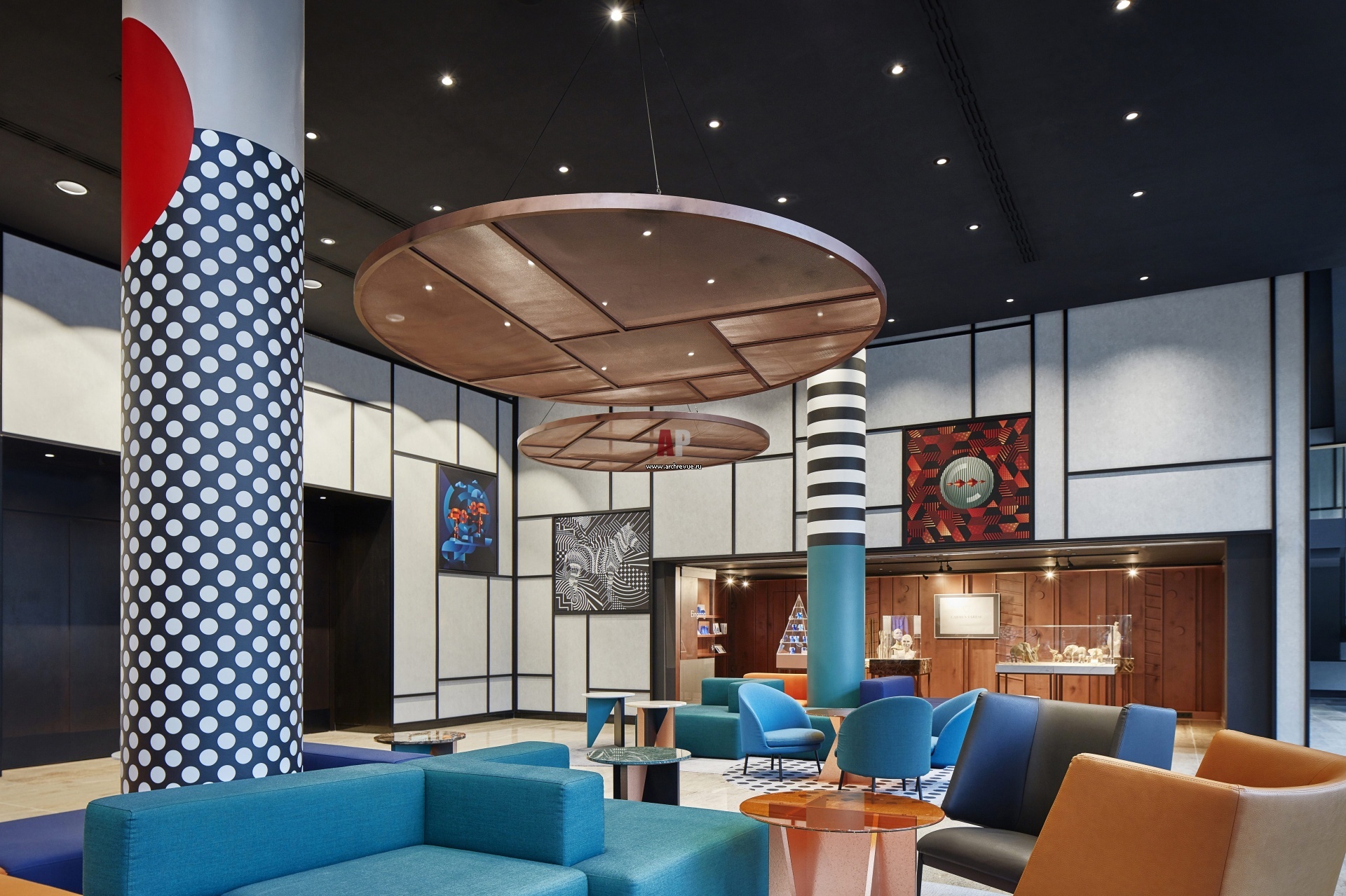 Зона отдыха в отеле, вдохновленной архитектурой Баухаус. Подвесные конструкции в форме дисков сделаны из металлического каркаса и медной сетки местными производителями. Колонны оформлены «звериным» принтом.