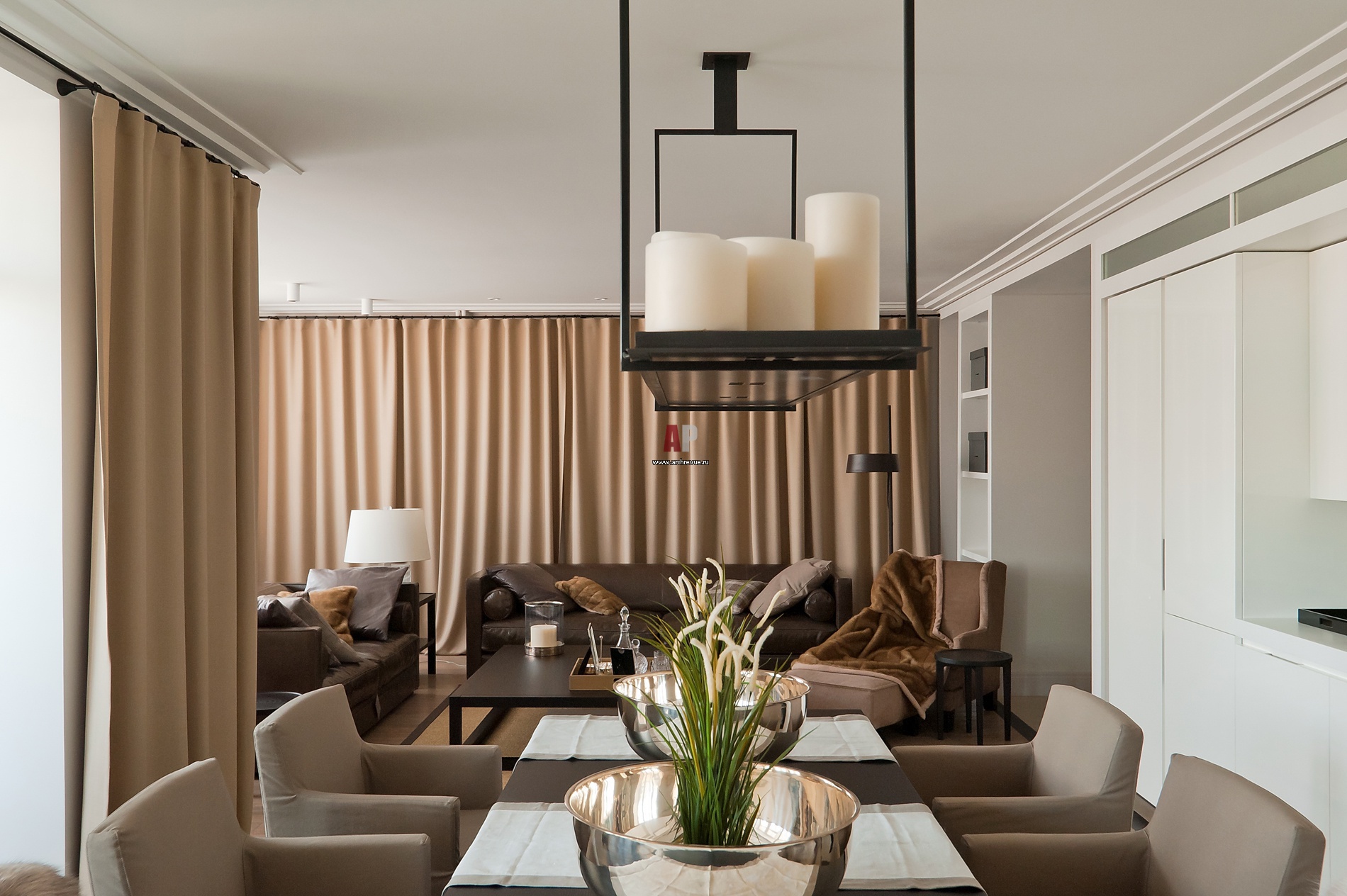 Вид со стороны столовой на гостиную. Стены общественной зоны выкрашены в теплый белый цвет (краски «Салон краски»). Светильник со свечами, Kevin Reilly.