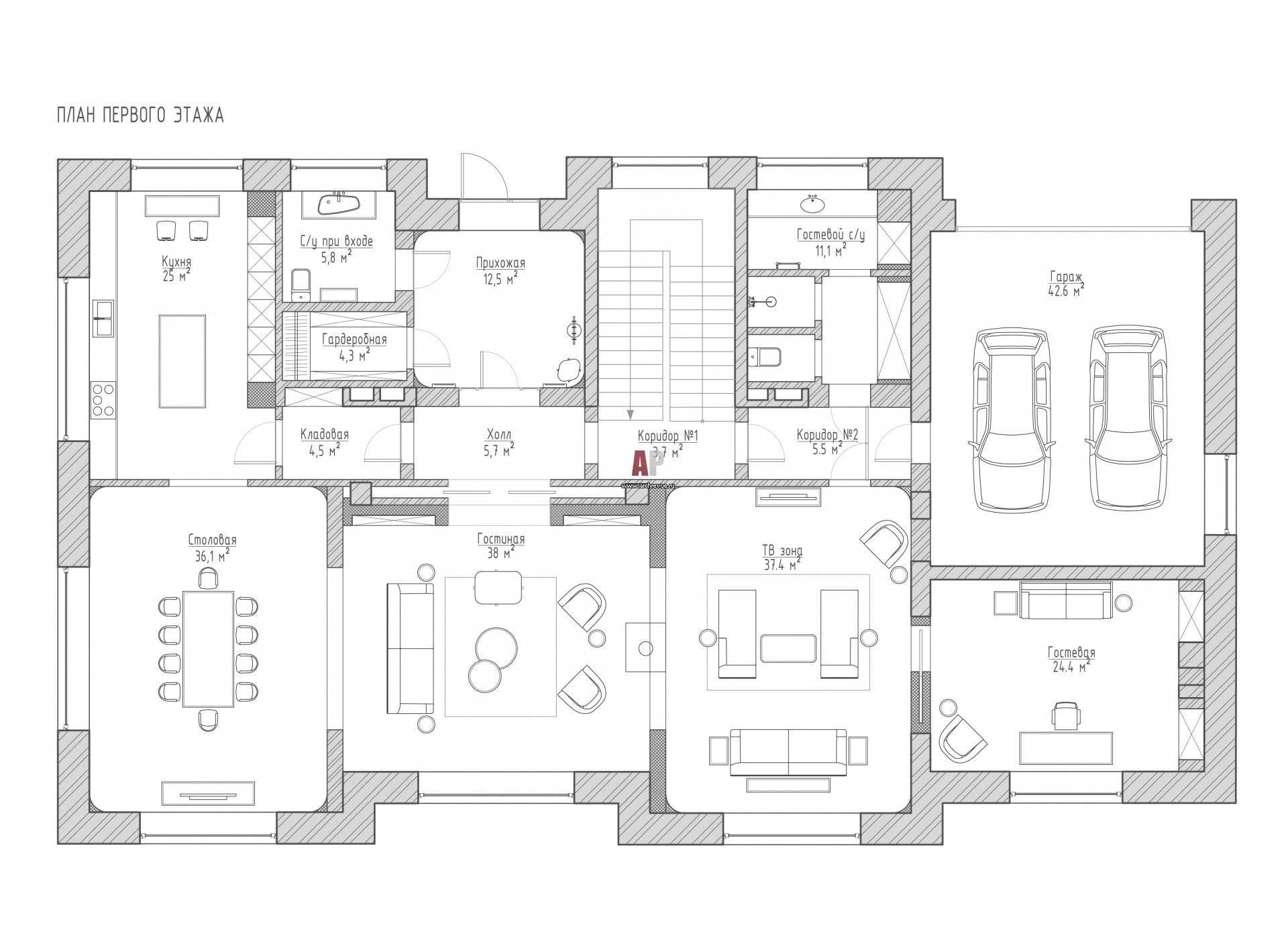 План первого этажа трехэтажного дома для продажи. Общая площадь – 850 кв. м.