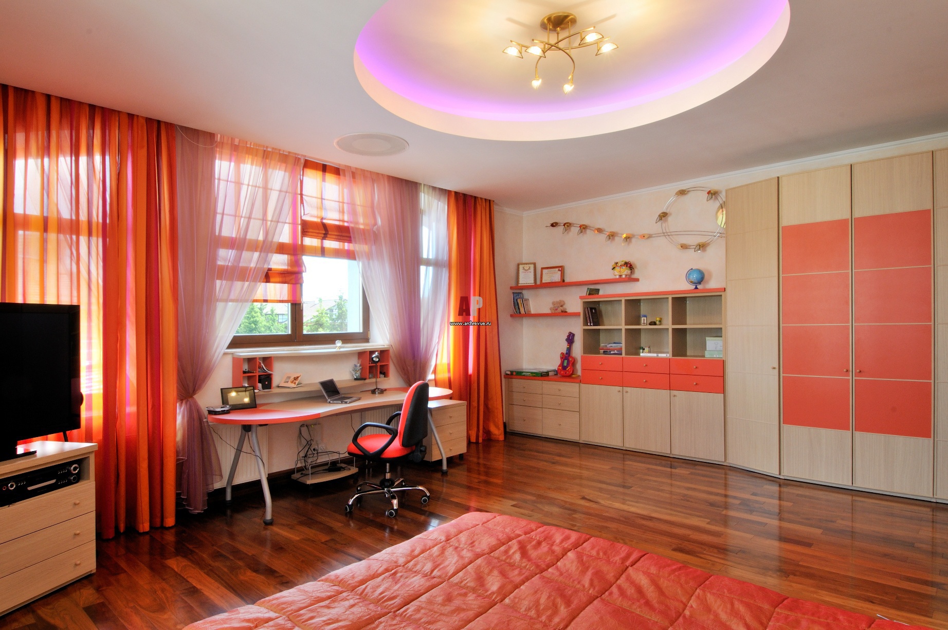 Просторная детская комната позволила сочетать все необходимые для детских зоны: спальное и рабочее место, небольшая гардеробная зона и достаточное пространство для игровой.