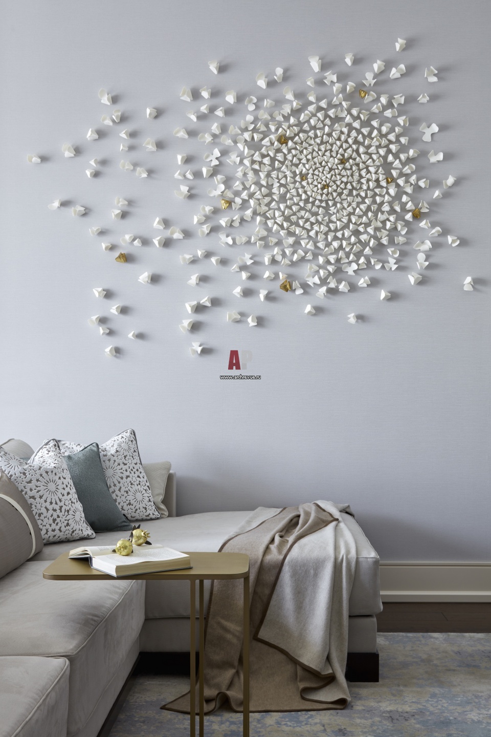 Украшение гостиной – настенное керамическое панно Valeria Nascimento в виде подхваченных ветром цветочных лепестков.