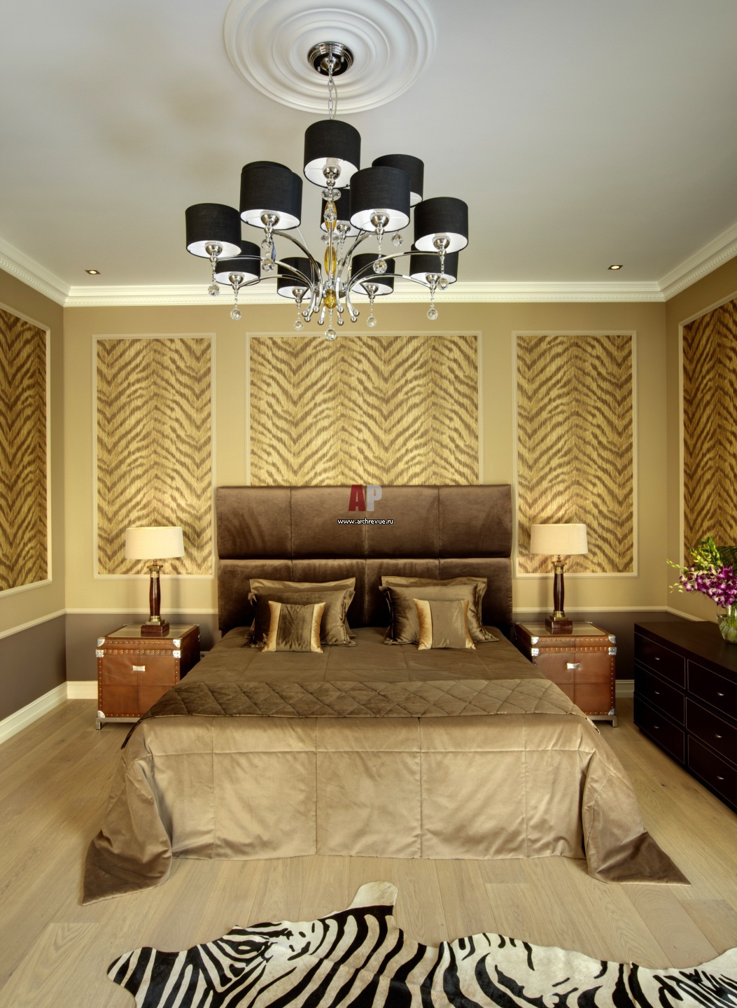 Фото интерьера гостевой спальни с колониальными мотивами. Стены оформлены вставками из обоев с анималистическим рисунком. На полу – шкура зебры.