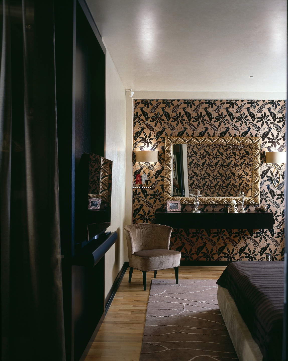 Фото интерьера пальни. Стена обтянута тканью от Dedar. Зеркало, Christopher Guy. Кресло, Giorgetti. Консоль под зеркалом, Poliform.