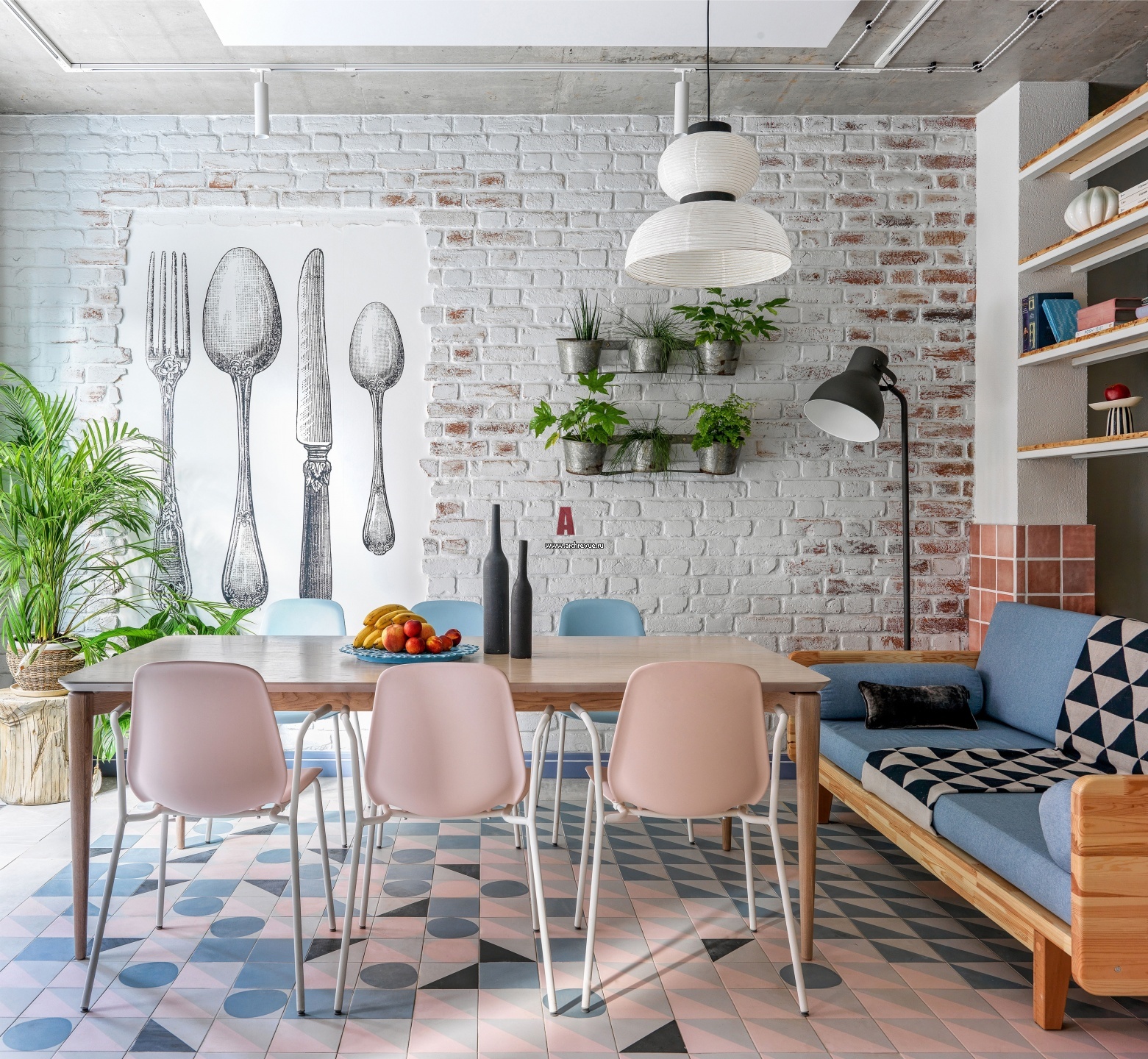 Таунхаус в скандинавском стиле. Интерьер столовой. На полу – ковер из плитки, Ceramica Vallelunga, серия 41zero42. Деревянный стол, SK Design.