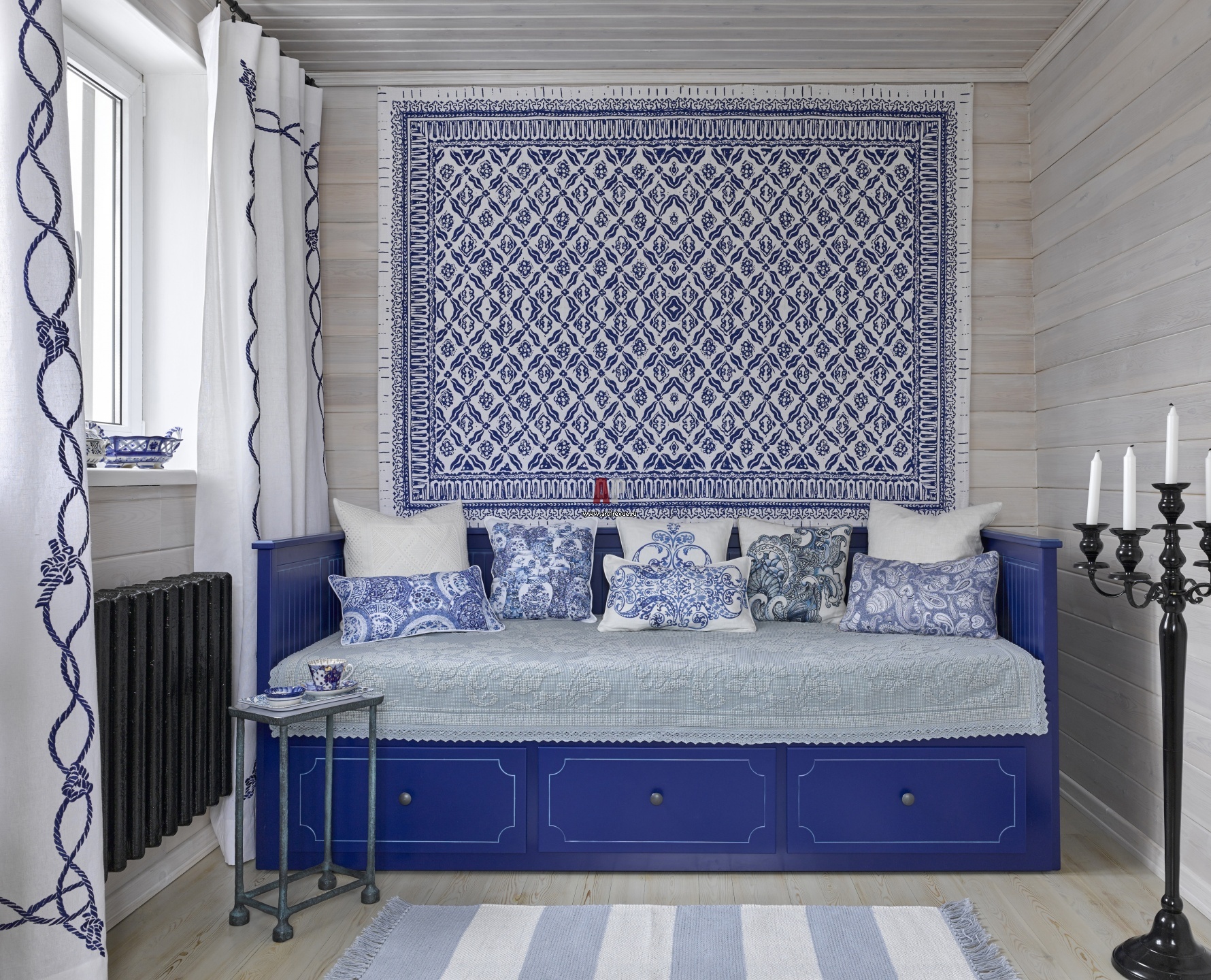 Зона отдыха в кабинете Кровать покрашена в насыщенный кобальтовый цвет. Ковер в бело-синих тонах, шторы, Zara Home.