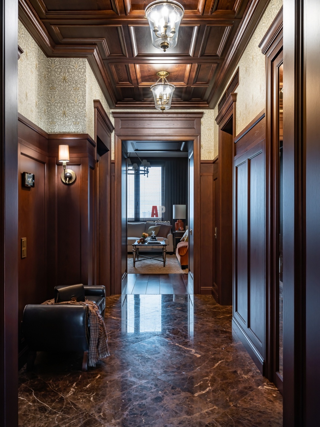 Интерьер прихожей. Потолок и низ стен зашит панелями из темного дерева. Верх стен оклеен английскими обоями, Morris & Co. На полу – слэбы мрамора Emperador Dark.