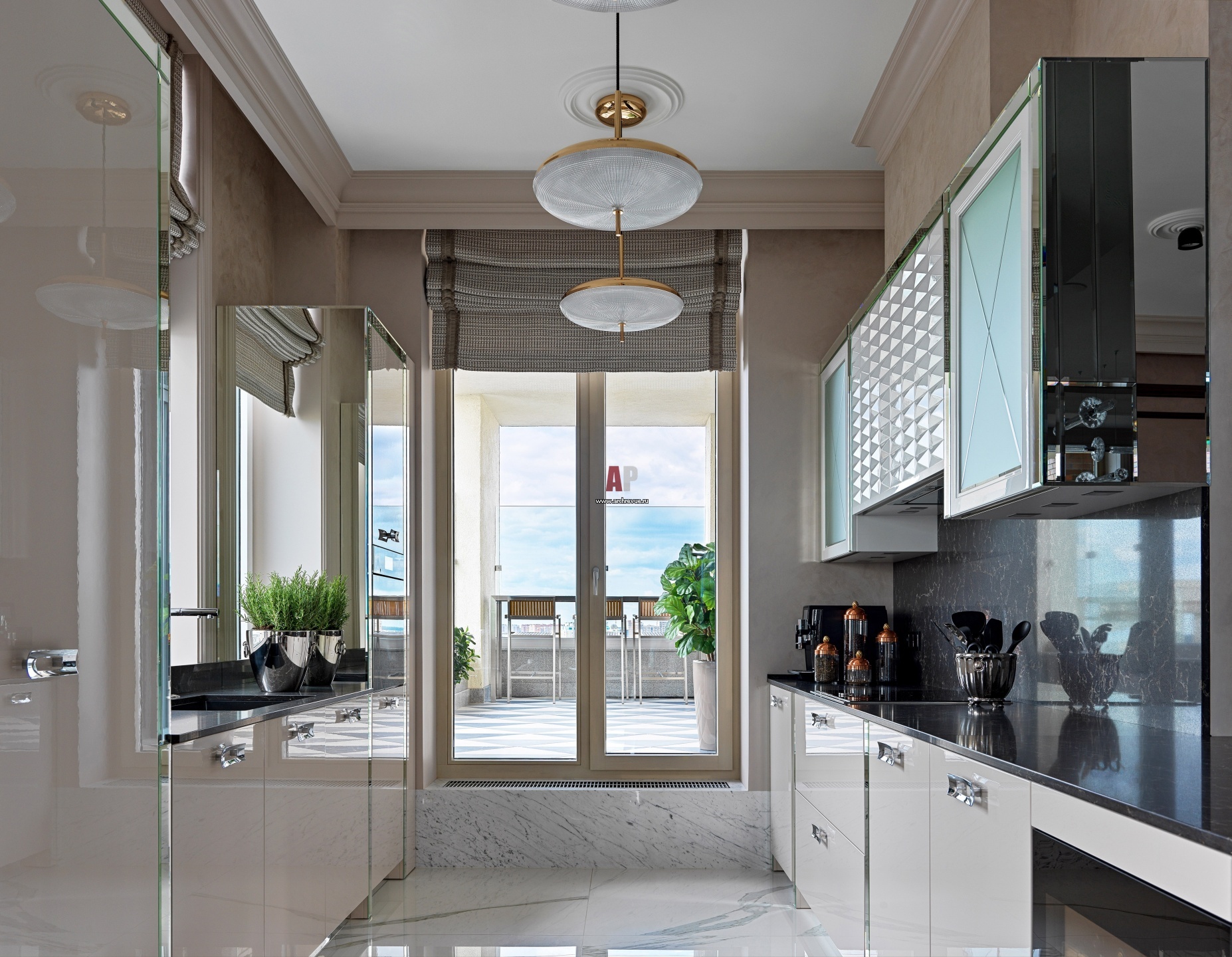 Кухня спроектирована как часть общей зоны, но от гостиной отделена простенком. Она имеет свой выход на открытую террасу. Кухонная мебель со шкафами для хранения и техникой скомпонована по двум противоположным стенам с центральным проходом.