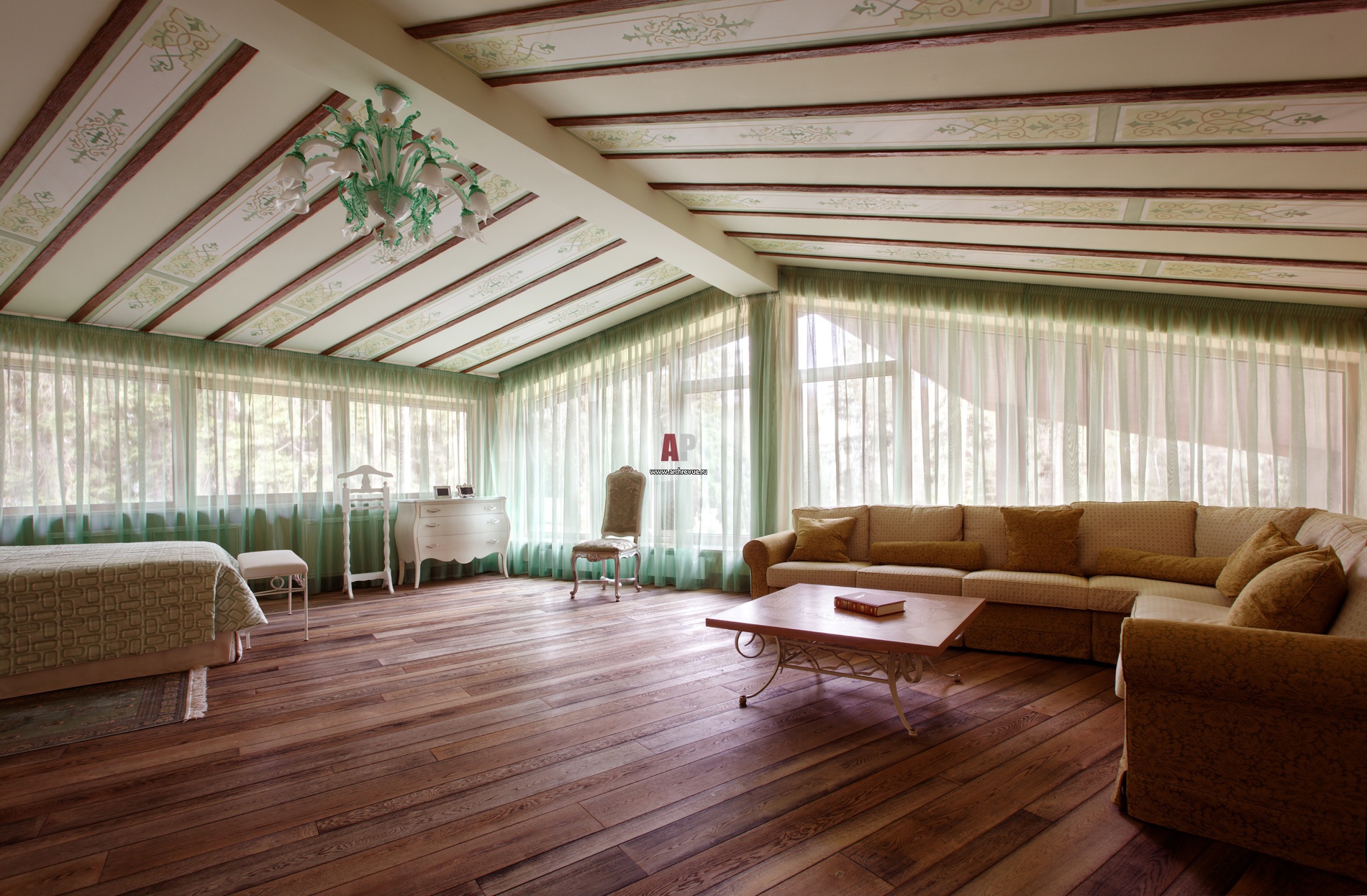 Зона отдыха в детской. Столик выполнен по эскизам авторов проекта российскими мастерами. Подстолье кованое, на столешнице – фрагмент художественного паркета, который уложен на первом этаже.