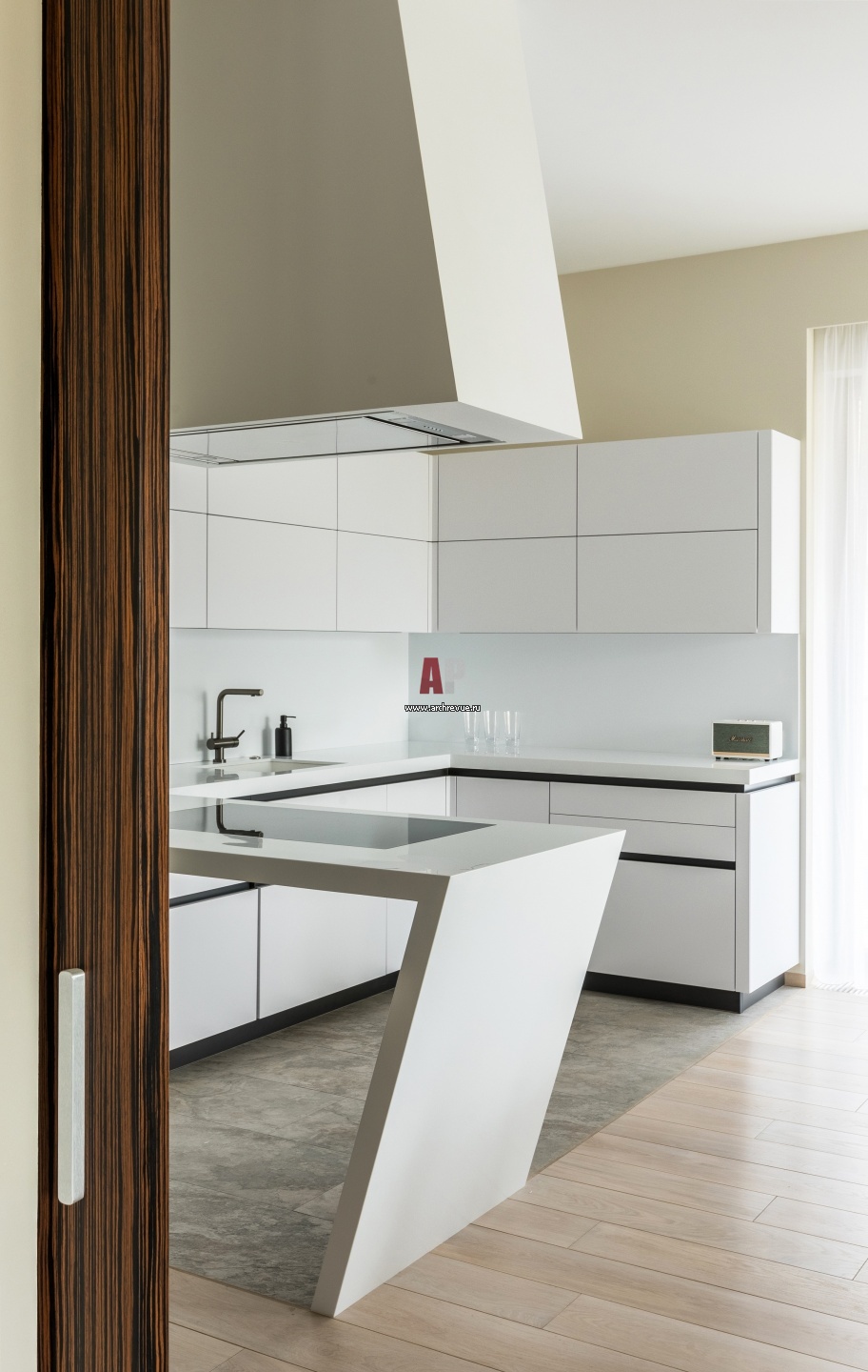 Примечательный элемент черно-белой лаконичной кухни – кухонный остров. Он получился очень тонким, в него интегрирована варочная панель, снизу она закрыта перфорированным камнем (он не позволяет нагреваться), а сверху дополнена вытяжкой со встроенной рабочей частью.