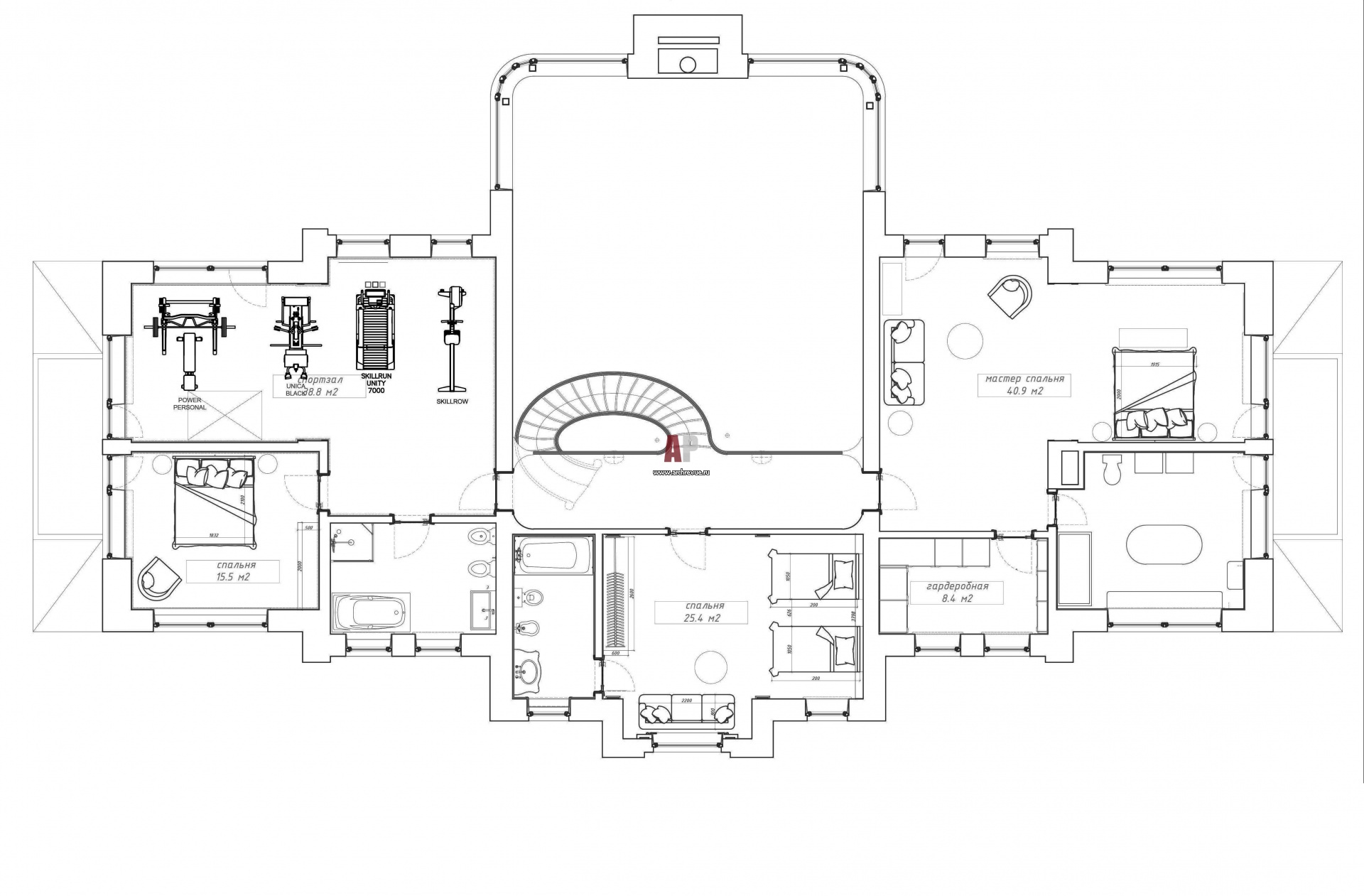 План второго этажа классического двухэтажного дома в Подмосковье. Общая площадь – 700 кв. м.