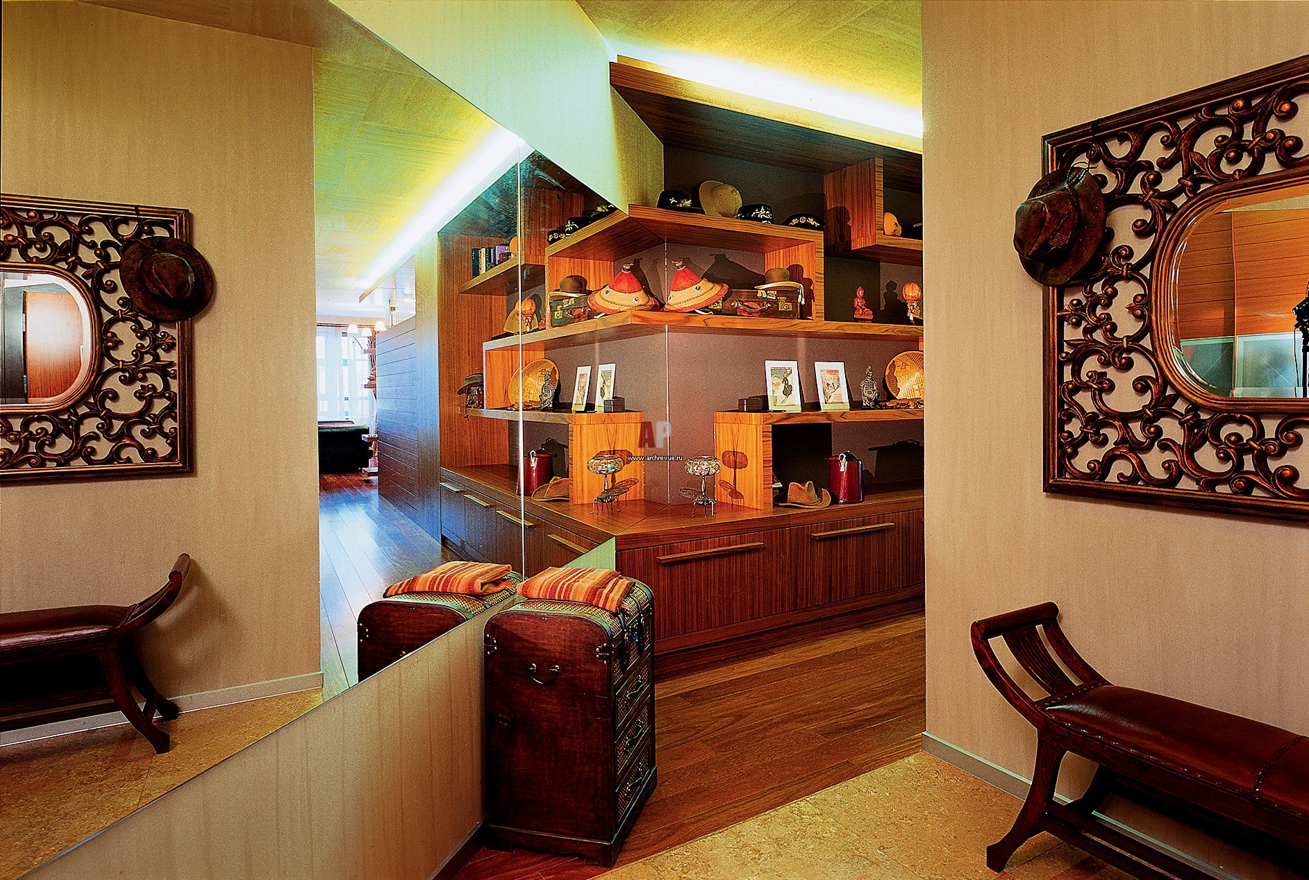 Фото интерьера прихожей. Чтобы впустить свет и глухое пространство неправильной формы, на плоскости стены, которая примыкает к холлу углом в 45 градусов, архитекторы установили огромное зеркало.