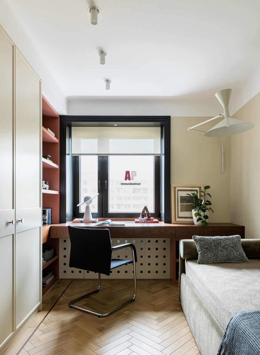 Кабинет с функцией гостевой. Диван, Twils. Винтажное кресло, Vitra. Шкаф, стеллаж и письменный стол сделаны на заказ. Светильник Lampe de marseille по дизайну Ле Корбюзье, Nemo.