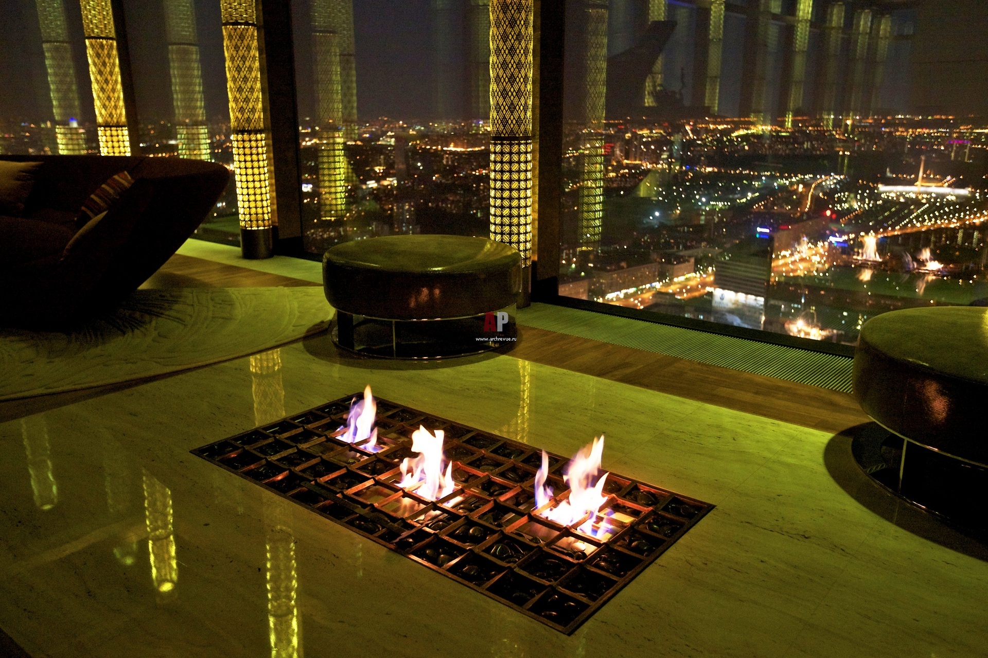 Интерьер экстравагантного пентхауса в сити при вечернем освещении.