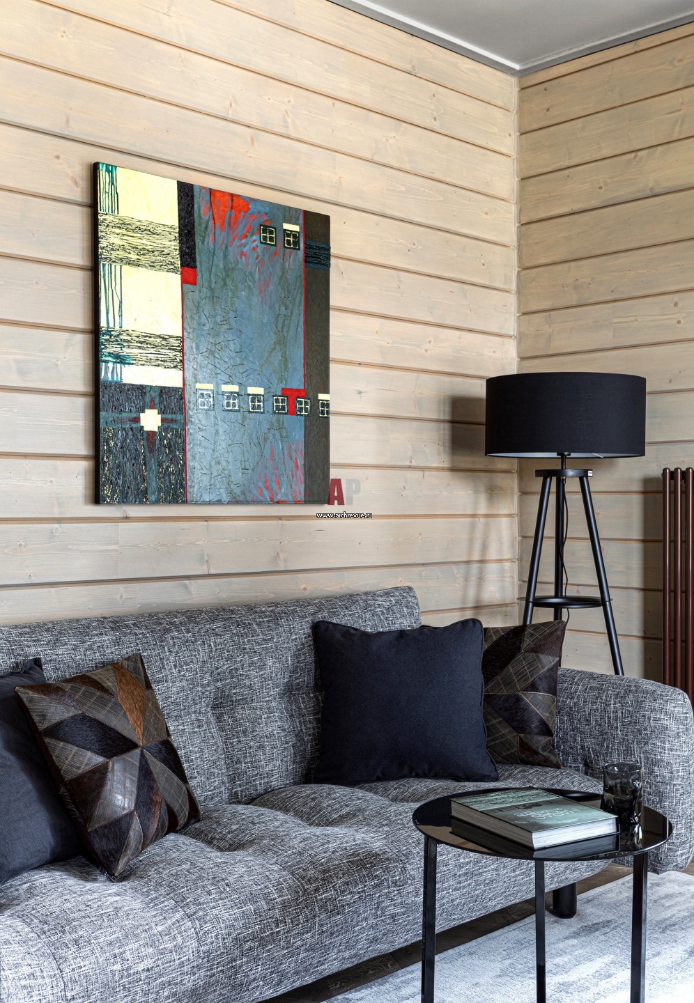Деревянный дом на Истре. Интерьер мужского кабинета. Диван, торшер, Kare Design. Журнальный стол, BD Barcelona Design.