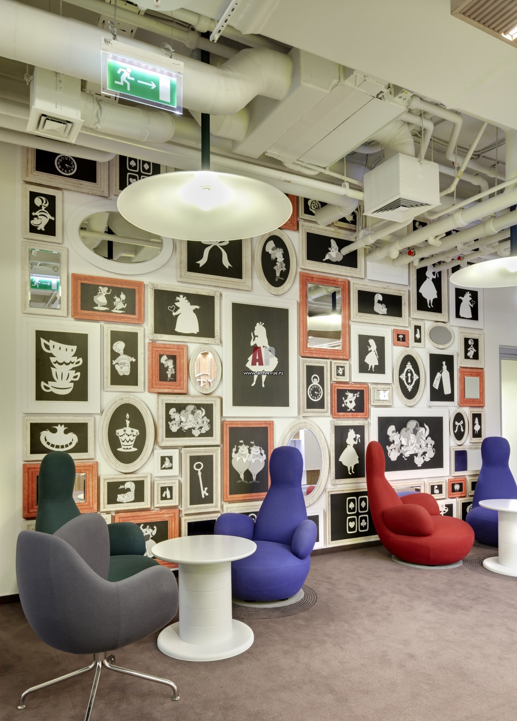 В интерьере приемной обращают на себя внимание силуэты героев мультфильмов в прямоугольных, квадратных и овальных рамах. За счет толщины рам, особенности техники исполнения и зеркал они кажутся объемными.