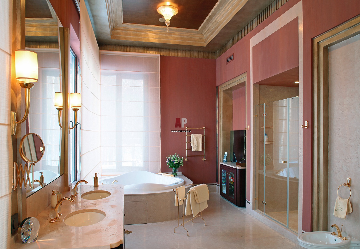 Интерьер санузла хозяйки созвучен цветовому решению спальни. Работы по укладке камня - «Гранит и Мрамор». Сантехника поставщик Villeroy & Boch.