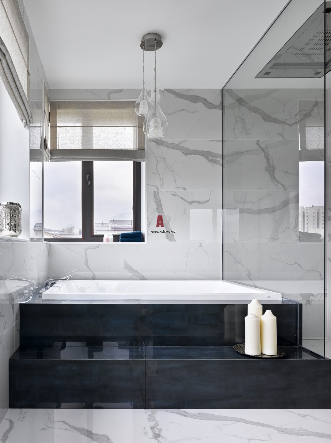 Хозяйский санузел. Ванна Noken встроена в подиум, который облицован темно-синим керамогранитом. Смесители, Dornbracht.