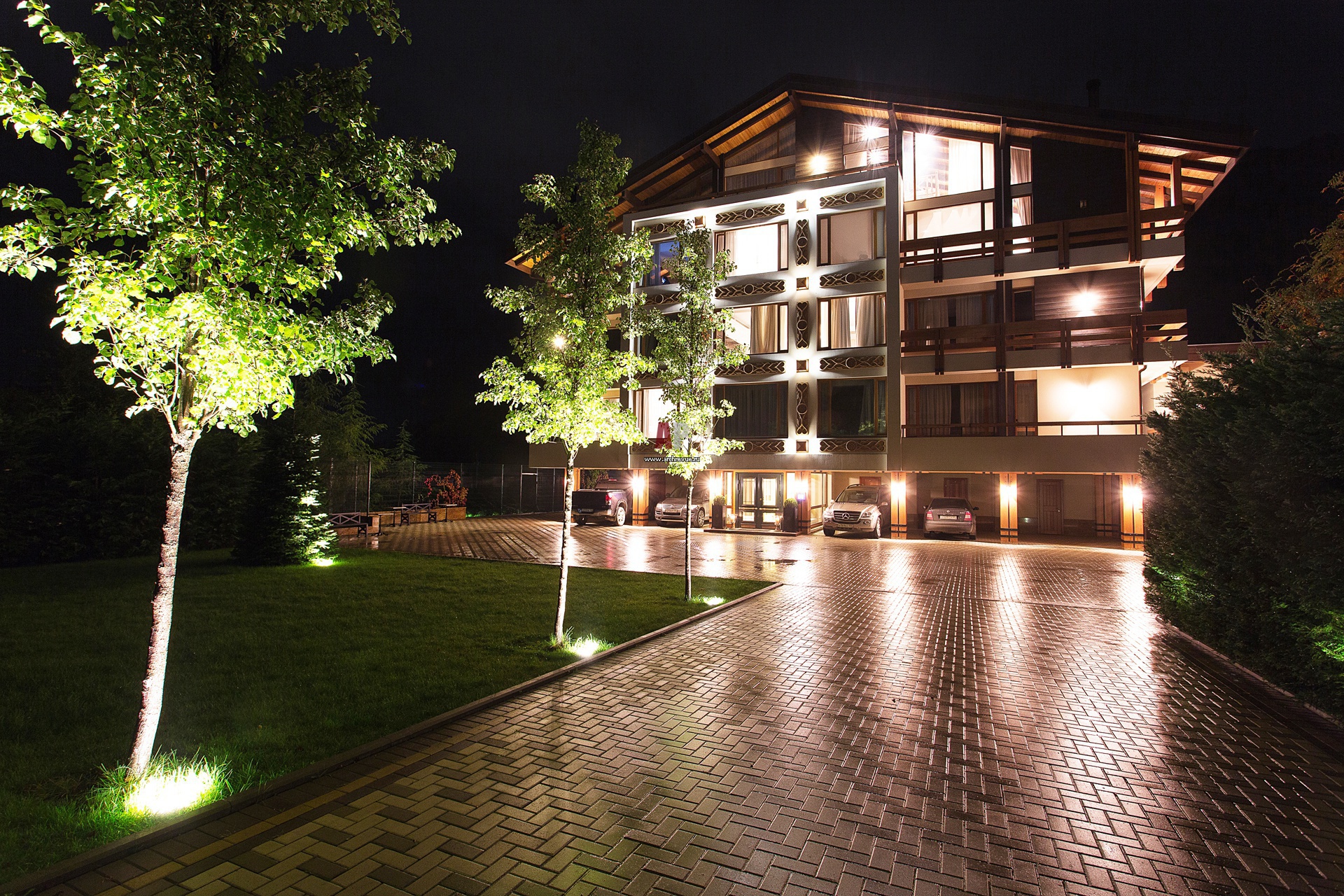 Пятиэтажный отель с мансардой выстроен в стилистке французского шале. Фасад оформлен резными деталями, окна деревянные, скатная кровля также подбита деревом.