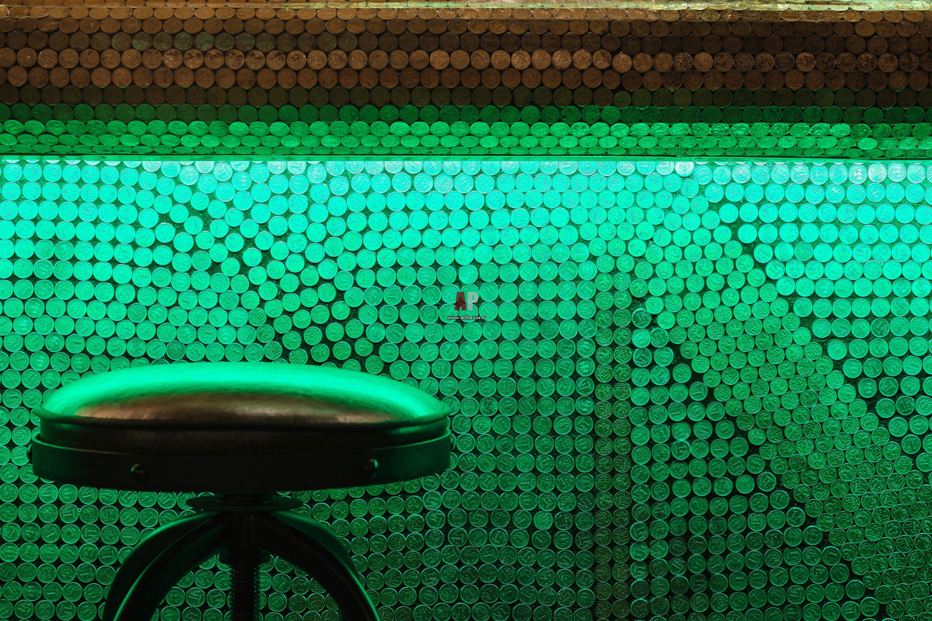 Интерьер бара ресторана. С помощью монет дизайнеры выложили надпись Made of money. Всего на оформление стойки пошло 120 тысяч монет на общую сумму 86 тысяч рублей.