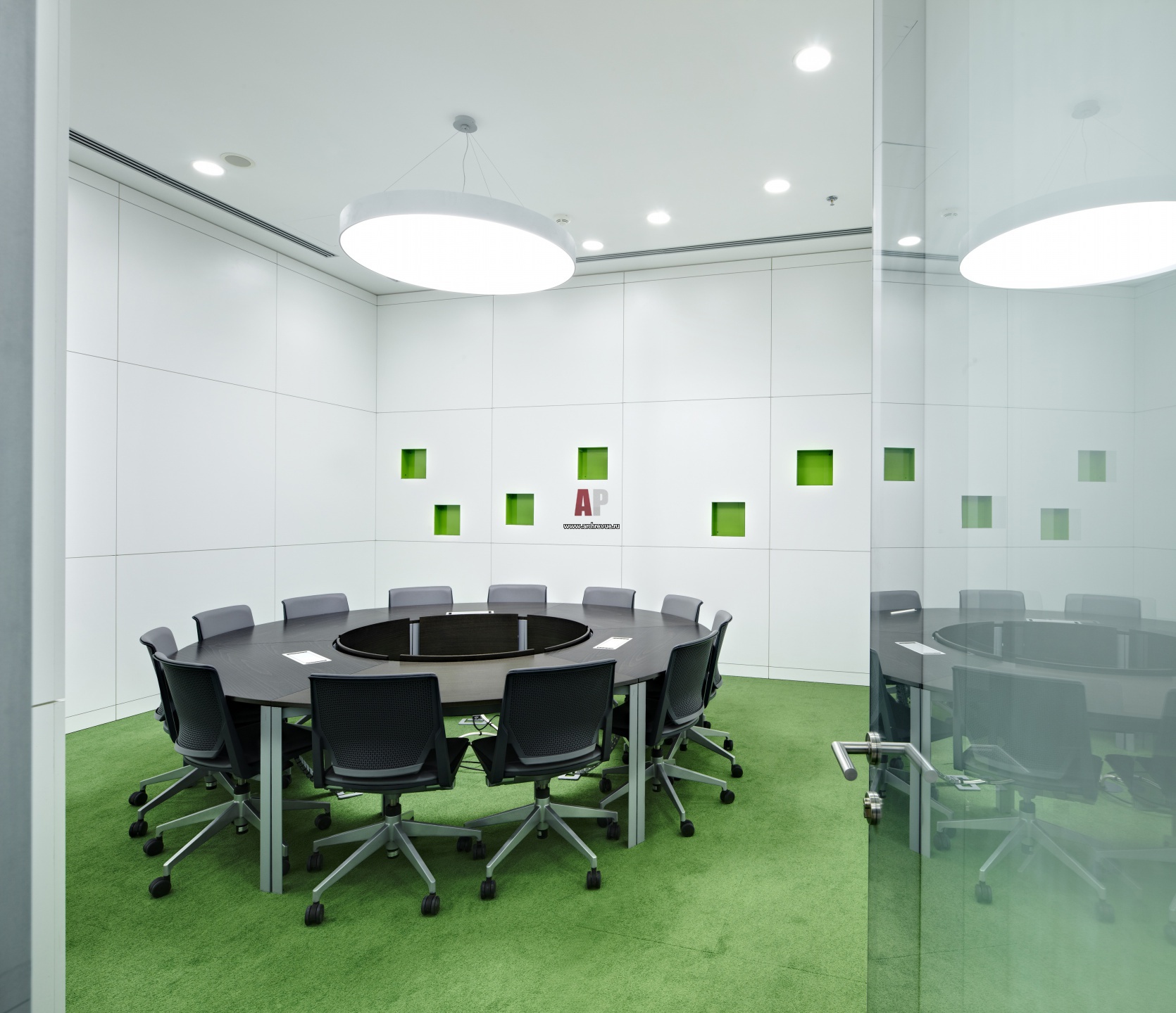 Интерьер переговорной в современном офисе. В отделках переговорных комнат прослеживается избранная цветовая концепция с символикой народных промыслов. В нее включены две «желтых», «синяя» и «зеленая» переговорные комнаты: 2 больших и 2 малых.