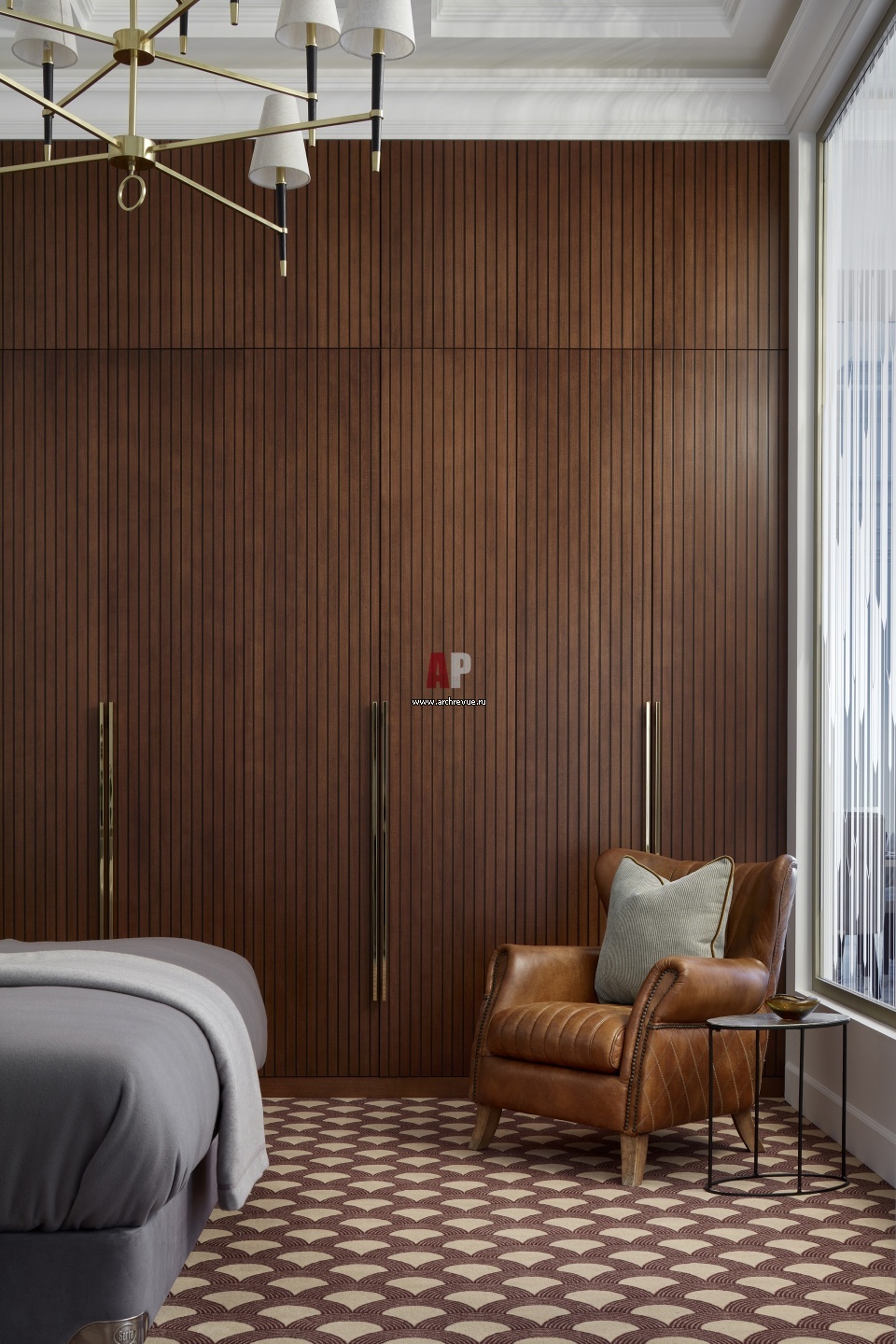Одну стену от пола до потолка в гостевой спальне занимает гардеробный шкаф. Он выполнен из натурального дерева, но благодаря фрезерованным фасадам не выглядит массивным.