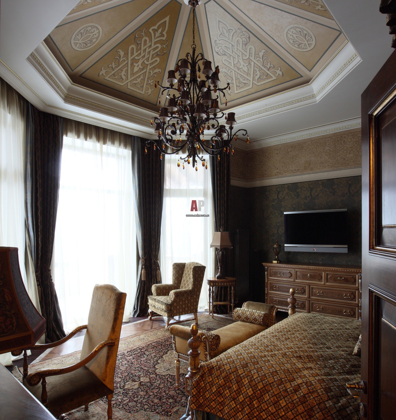 Особенность каждой спальни дома – пышно декорированные потолки.