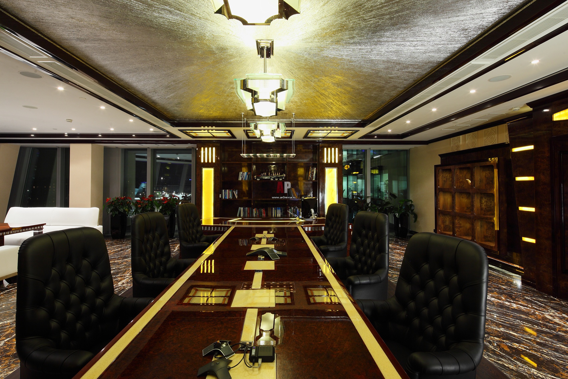 Входная группа отсылает к древнеегипетской архитектуре. Дверной портал, библиотека и настенные панели сделаны из древесины корня ильмы российскими мастерами.